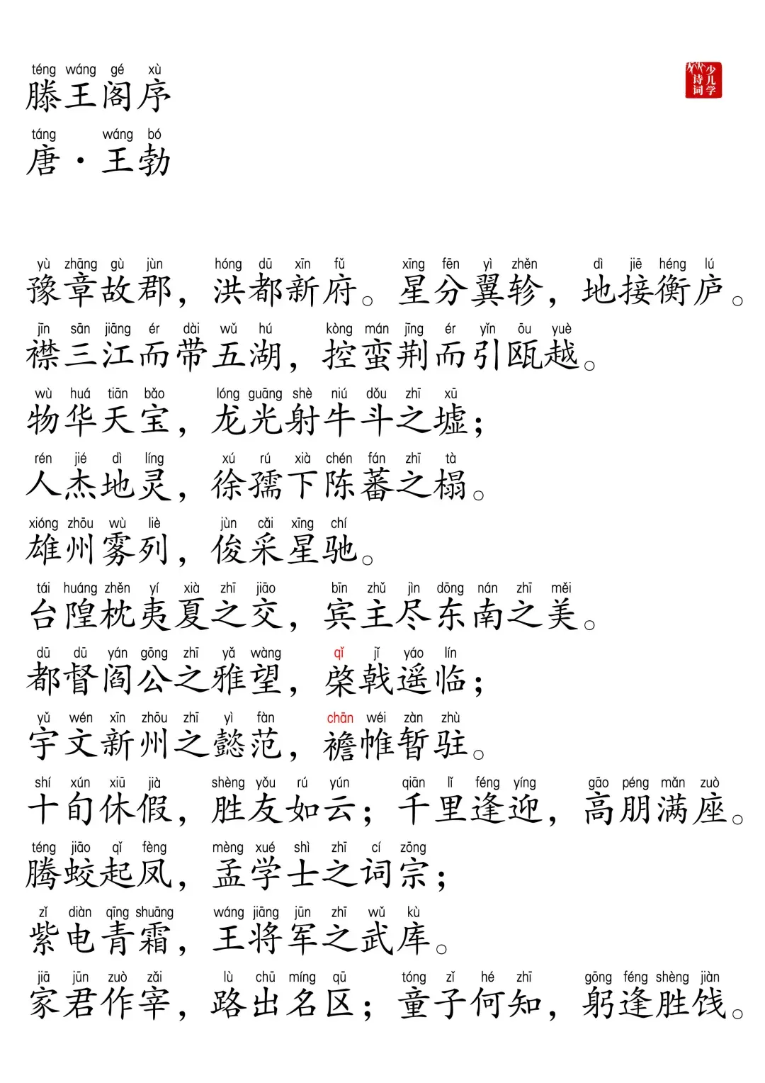 《滕王阁序》全文带拼音,下载pdf,可直接打印 《滕王阁序》注音版文件效果如上,一共有5页,上面是第1页。我所制作的注音资料,对于容易读错的字都标红色,更便于学习。 下载PDF文件的方法: 方法一: 点击链接或复制整段内容,打开「夸克APP」即可获取。 /~caad37fYvk~:/ 链接:https://pan.quark.cn/s/89bcdaf5f20e?pwd=TyiG 提取码:TyiG 方法二: ⇙点击左下角的“阅读原文”下载。如果还没有注册夸克网盘,按照流程注册即可。记得及时把PDF文件保存到自己的网盘及下载,以防链接失效。