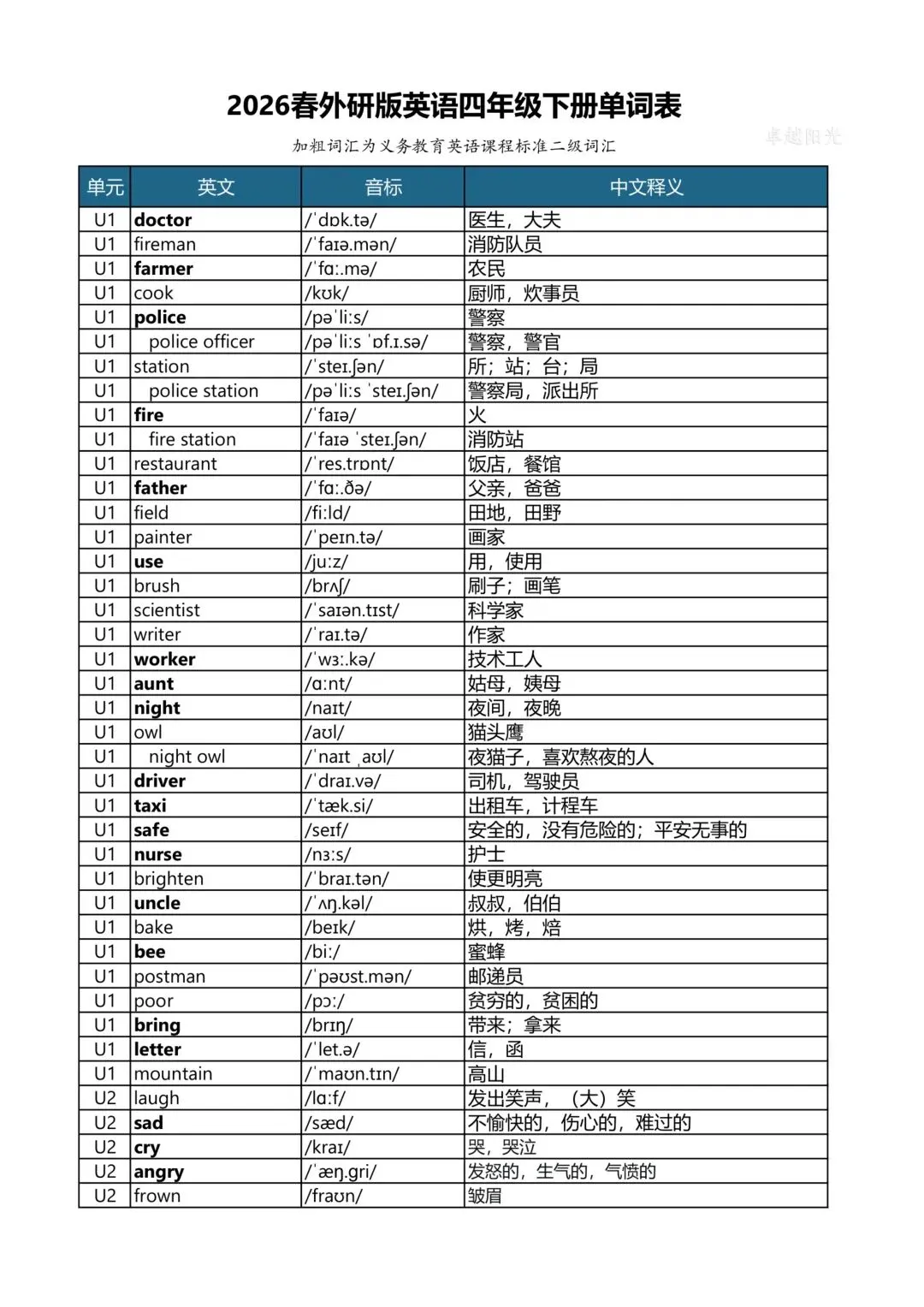 需要的家长可以打印出来,让孩子预习一下这份26新四年级下册外研三起版英语U1-U6 单词表,帮孩子高效背单词、夯实词汇基础,课前预习、课后复习、考前突击都能用,记词又快又准,英语学习更轻松!
