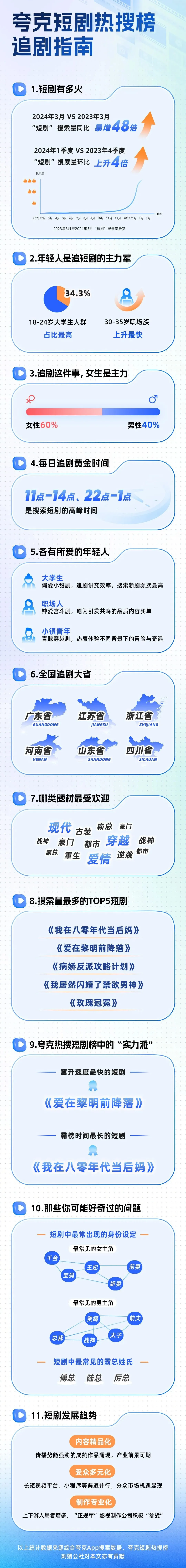在夸克App发布的《夸克短剧热搜榜追剧指南》(以下简称《指南》)显示,18-24岁年轻人在夸克搜索短剧的各年龄段人群占比高达34.3%,占有绝对领先优势。30-35岁年轻人搜索短剧的人群占比上升速度最快,短剧毫无疑问成为年轻人的心头好。这些年轻人的追剧时间普遍集中在每天中午11点-14点、晚间22-凌晨1点。