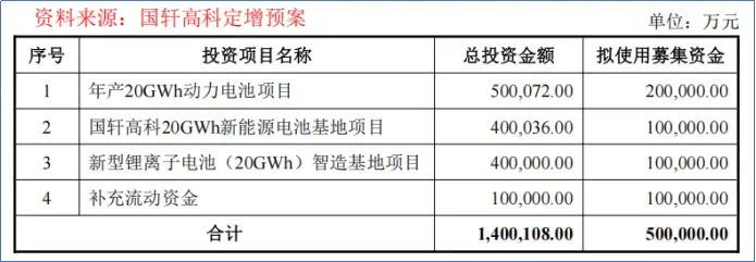 2026年2月,国轩高科发布新一轮定增预案,拟募资不超过50亿元,用于支持多个电池项目基地建设及补充流动资金,合计投资140亿元。