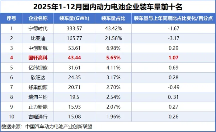 2025年,国轩高科动力电池装车量为43.44GWh,市占率5.65%,与宁德时代、比亚迪差距较大。