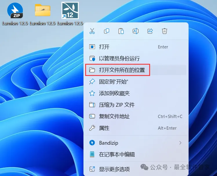 9、回到桌面,右键桌面上的【Lumion 12.5软件图标】,点击【打开文件所在的位置】