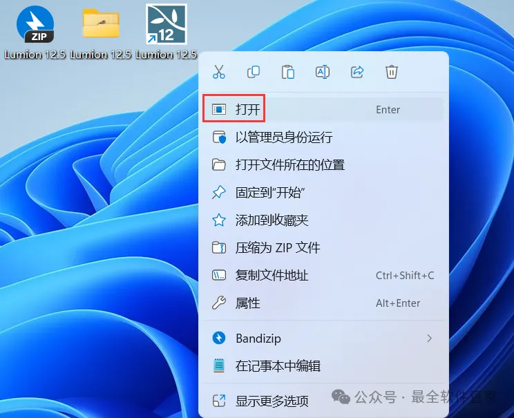 15、回到桌面,右键桌面上的【Lumion 12.5软件图标】,点击【打开】