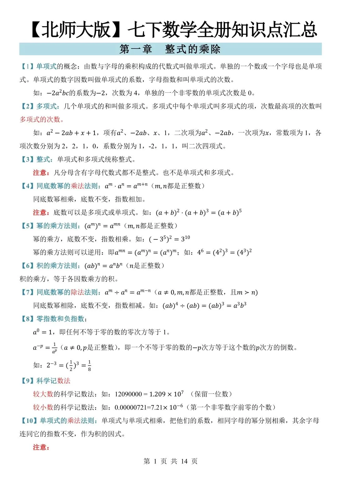 2026年春北师大版七年级下册数学全册重点知识点总结‖完整电子版可打印