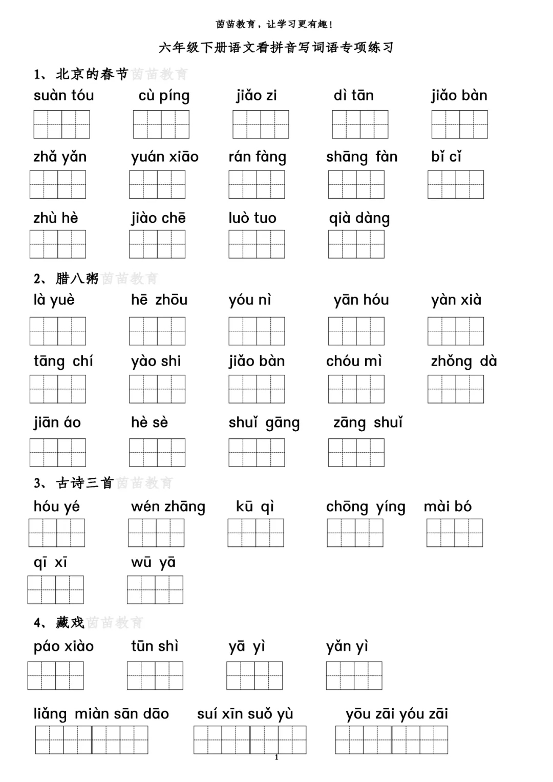 六年级下册语文词语表看拼音练习pdf下载,家长都收藏了!