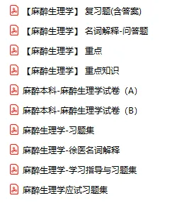 今天分享的资料是「0041-麻醉生理学」电子版+学习笔记+知识点总结+期末考试重点+复习资料+习题集及答案+名词解释+历年真题试卷及答案+题库及答案+复习重点+思考题及参考答案+公式总结+考试重点基础题+知识总结+高清PDF可打印+免费分享!