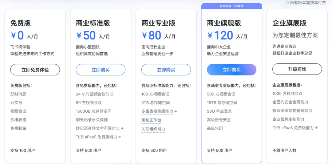 飞书的收费模式,是其最大的“硬伤”。所有版本严格按用户数按年付费,最便宜的商业标准版50元/人/月,折合600元/人/年。一家2000人的企业,仅标准版一年成本就高达120万,还不包含增值服务费用。