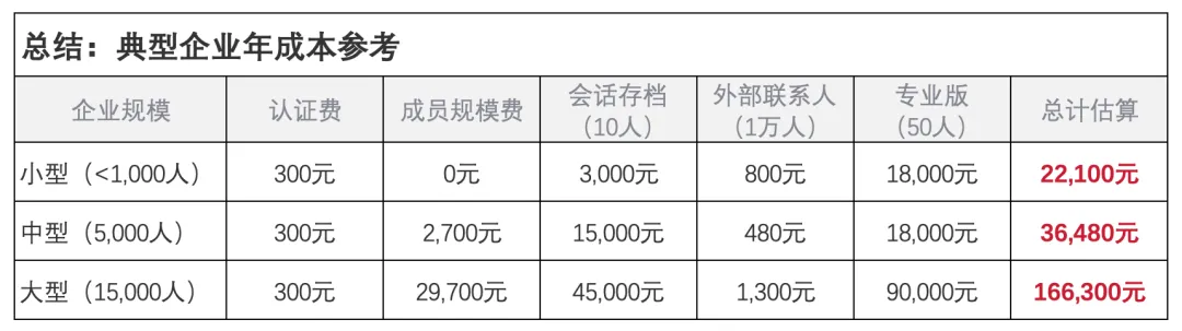 企微的基础功能免费,但当企业的外部联系人(客户)规模巨大时,接口费、存档费并不便宜。企业规模越大,一年的服务版费用就越高。但考虑到其能直接触达微信7.5亿活跃用户,对于依赖私域增收的企业,这笔成本依然“物有所值”。