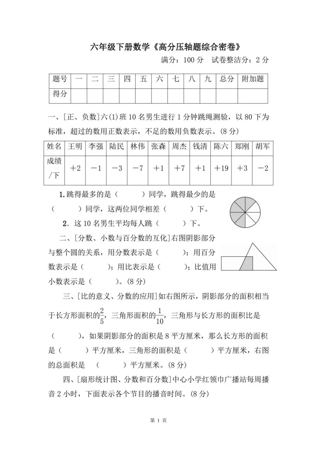 六年级下册数学高分压轴题综合密卷(电子版可打印附答案)