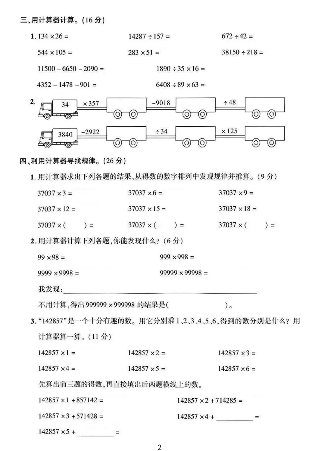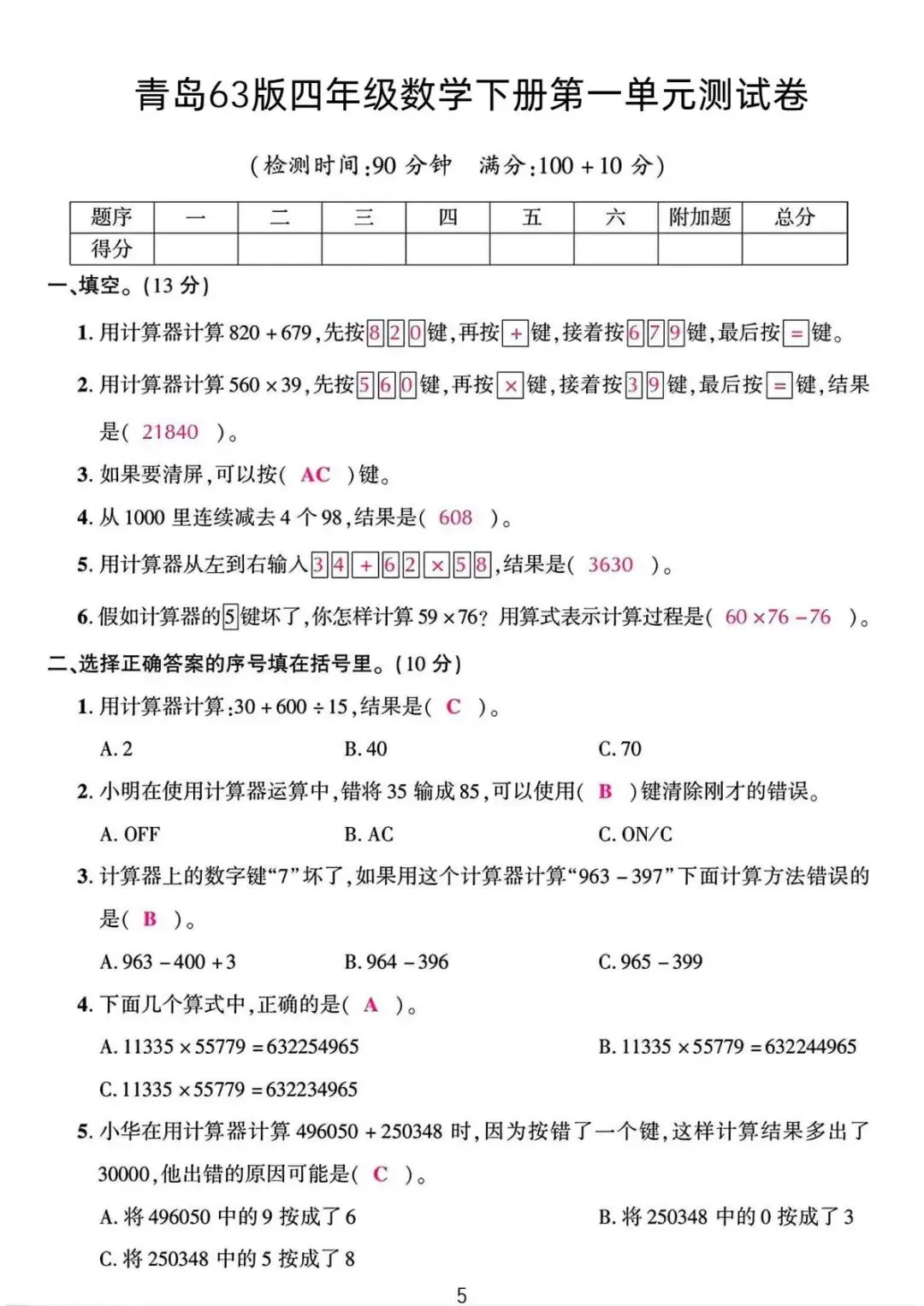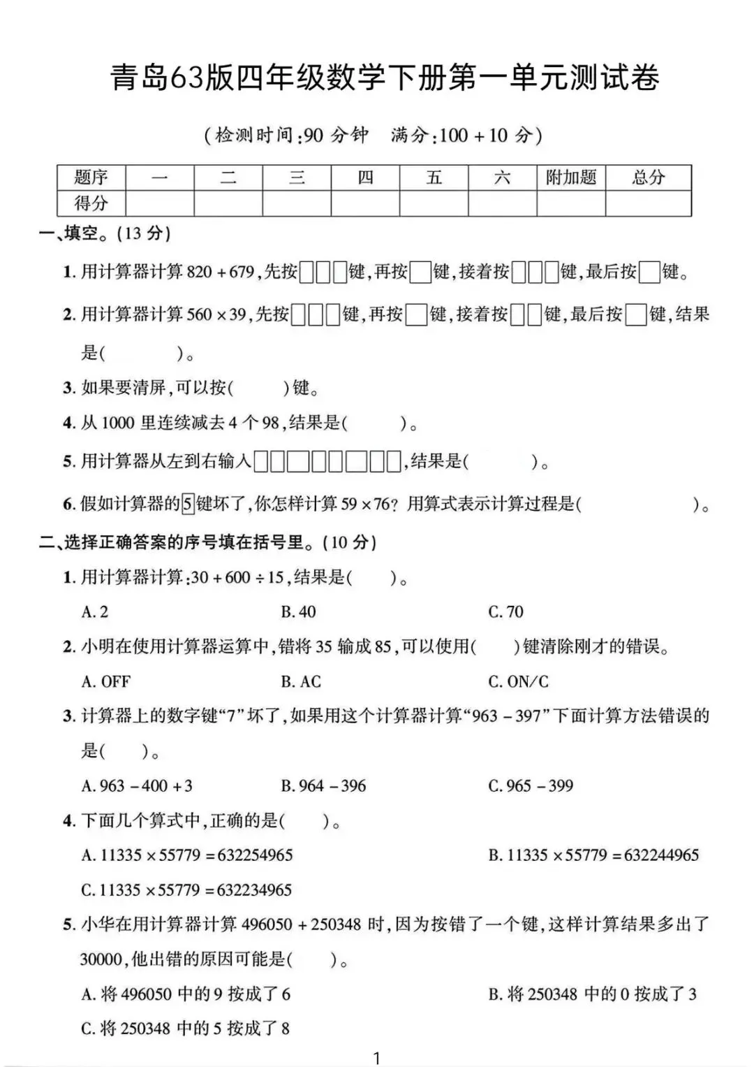 四年级家长们注意!孩子学习青岛六三版四年级下册数学第一单元,知识点掌握得好不好?考试心里没底?别担心!我们精心打造了本单元测试卷。