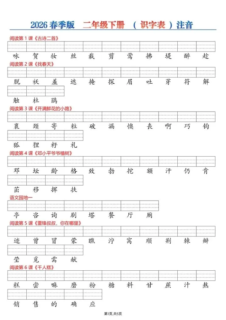 二年级下册语文《识字表注音练习》含答案,电子版可打印