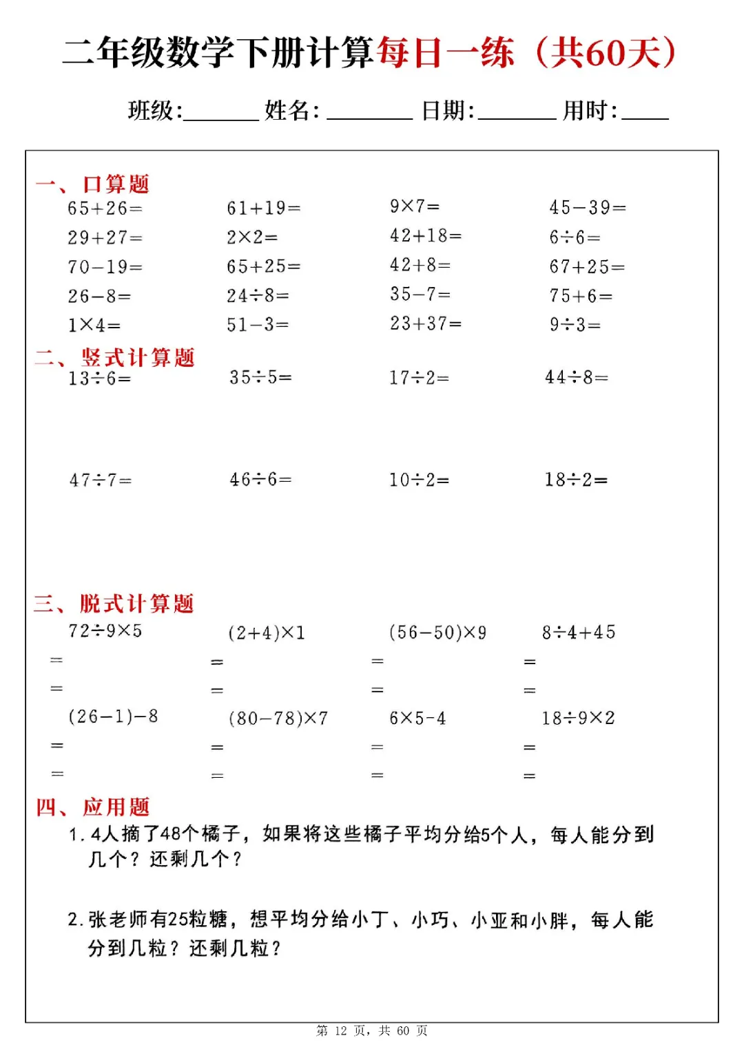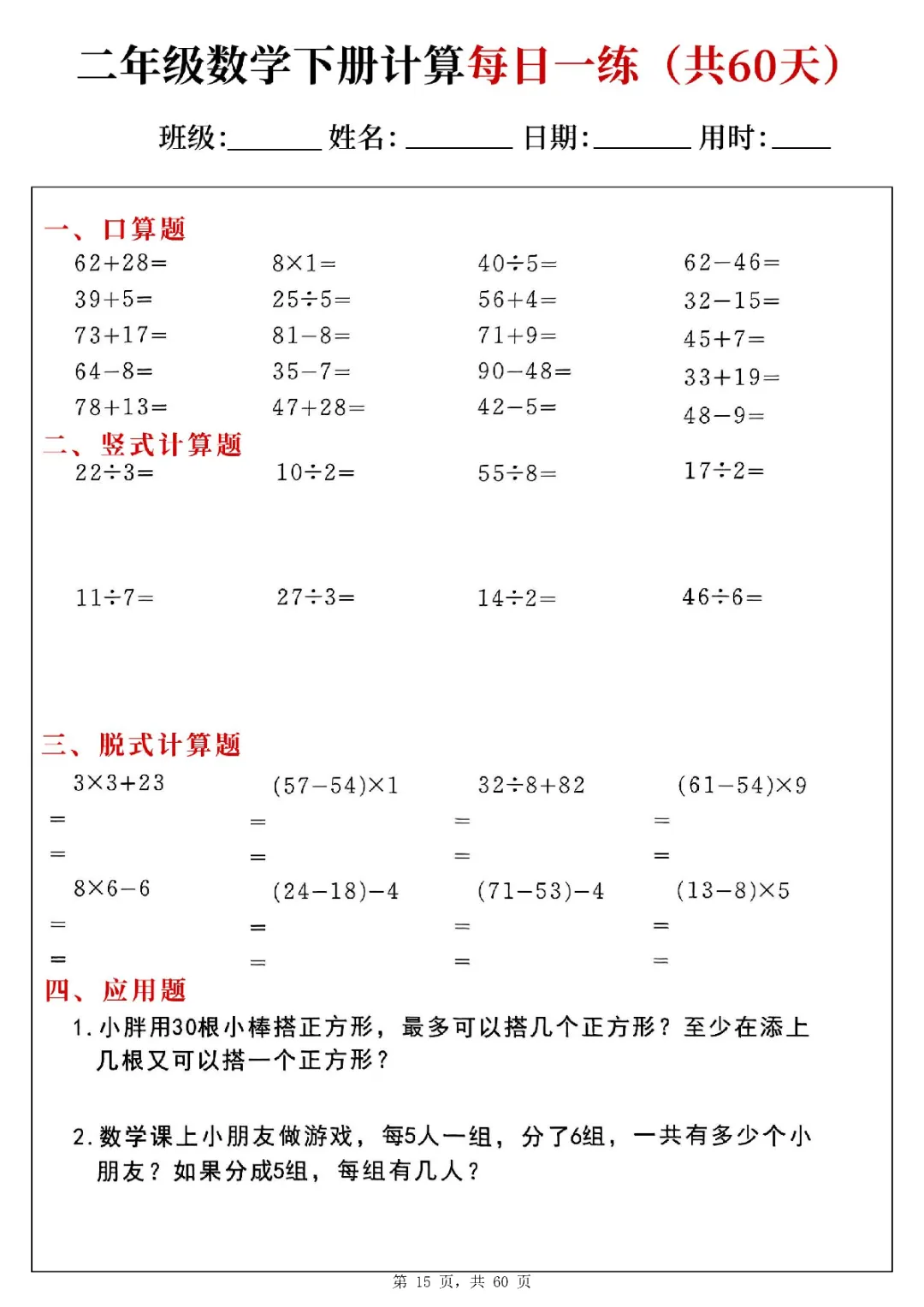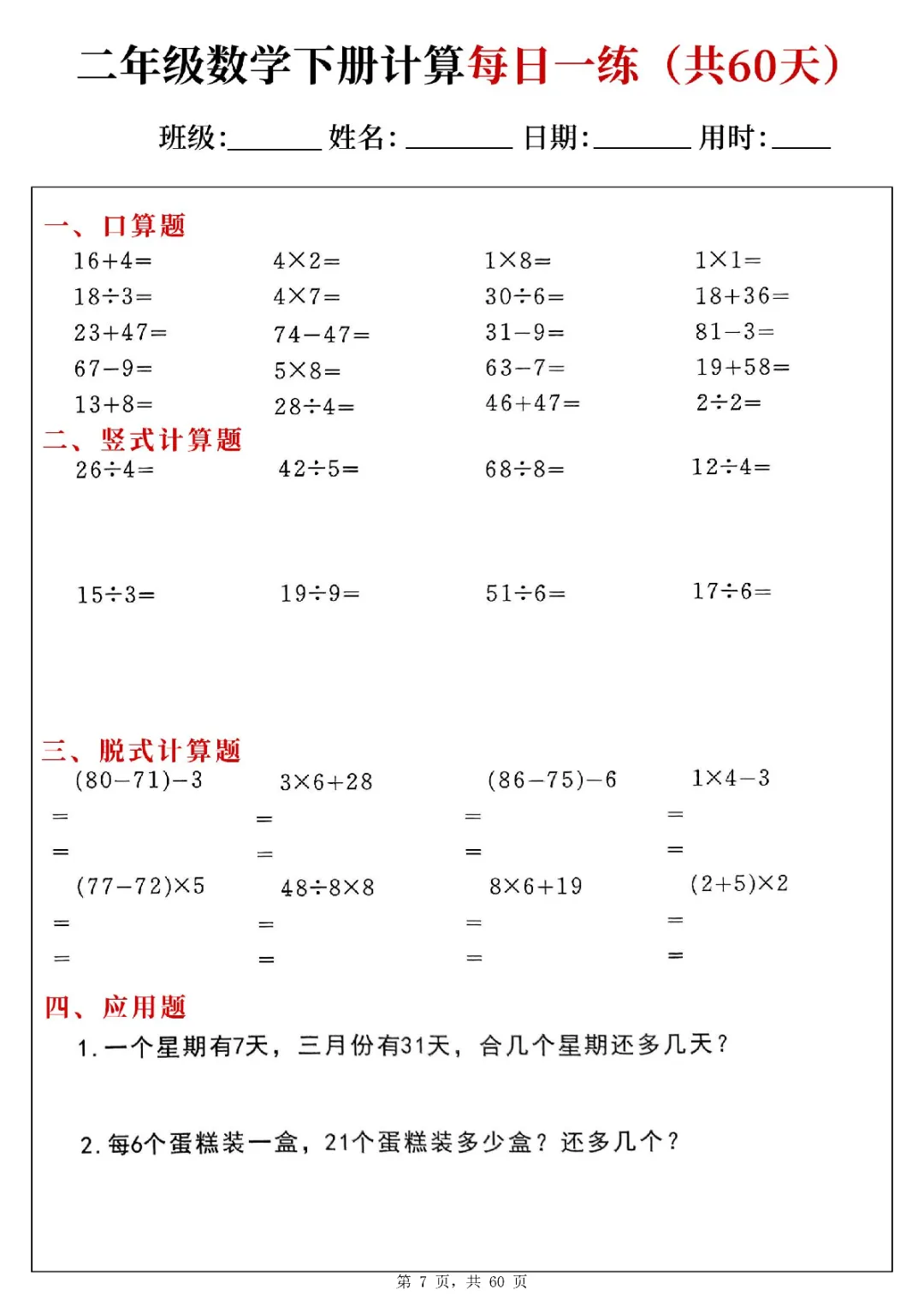 2026年二年级下册数学计算每日一练|电子版可打印