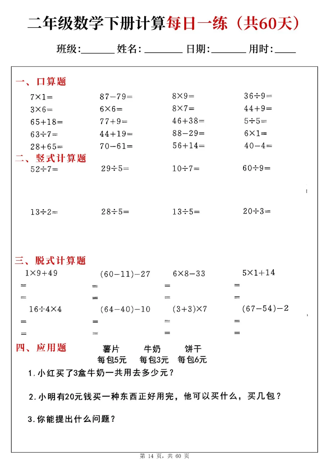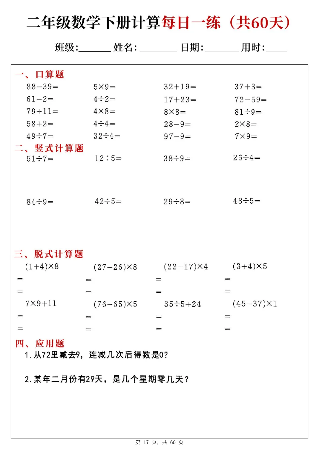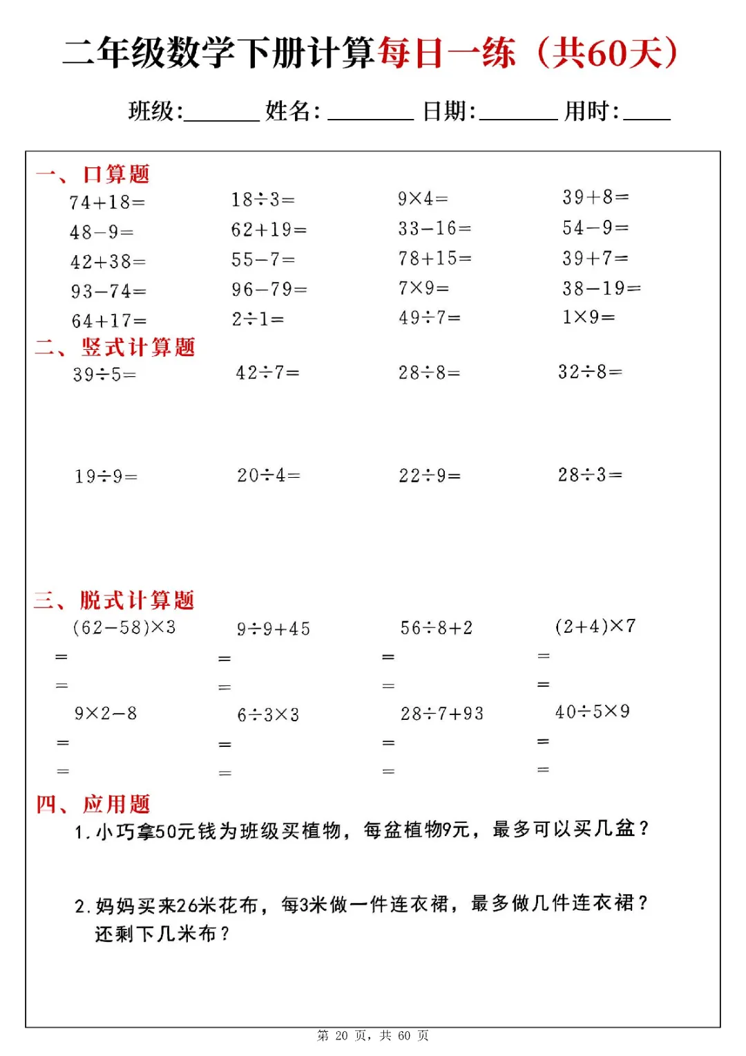 2026年二年级下册数学计算每日一练(电子版可打印)