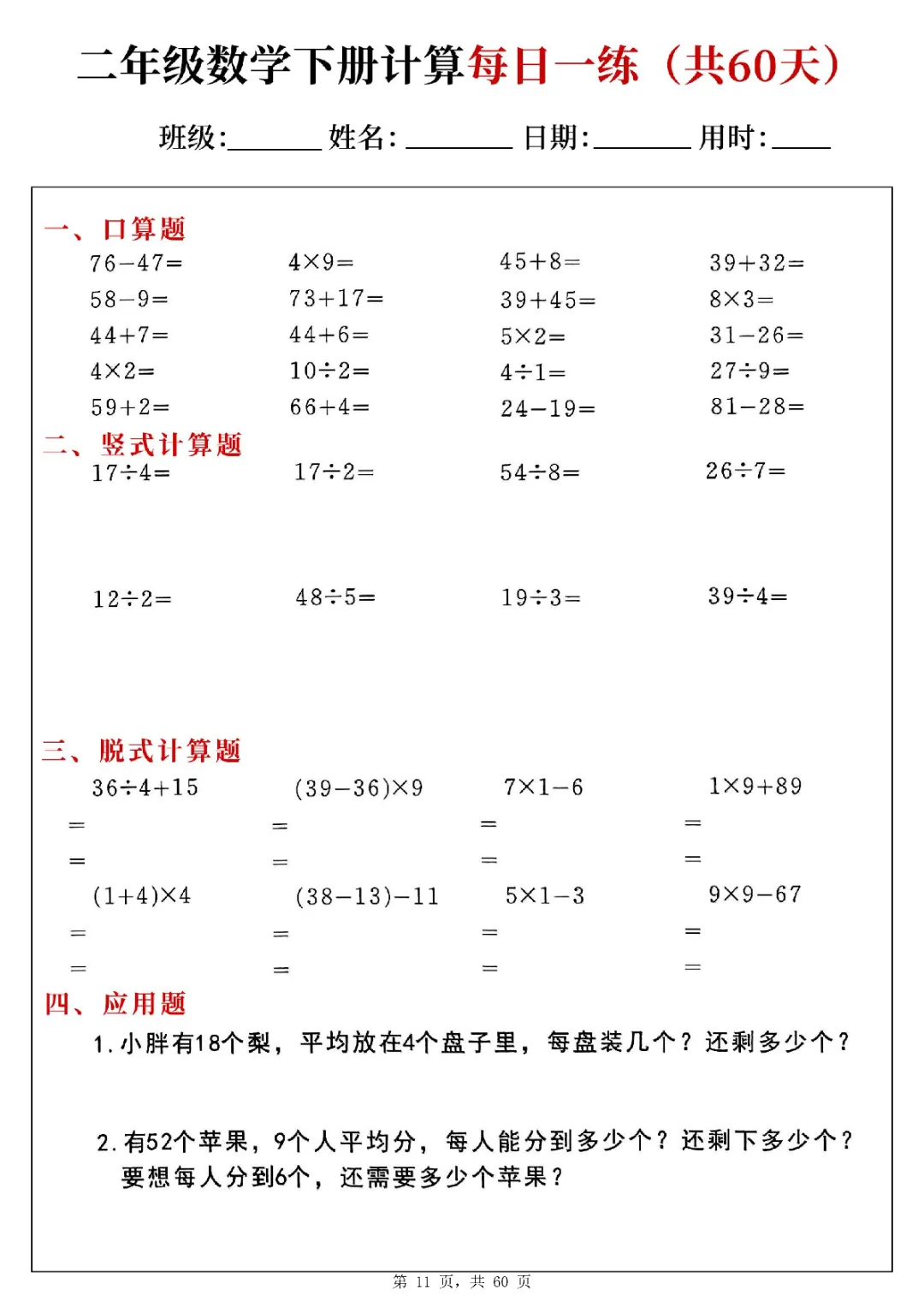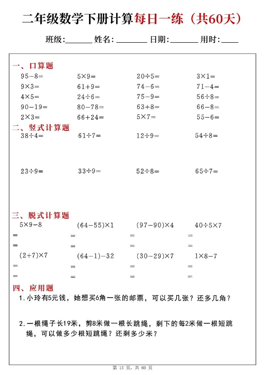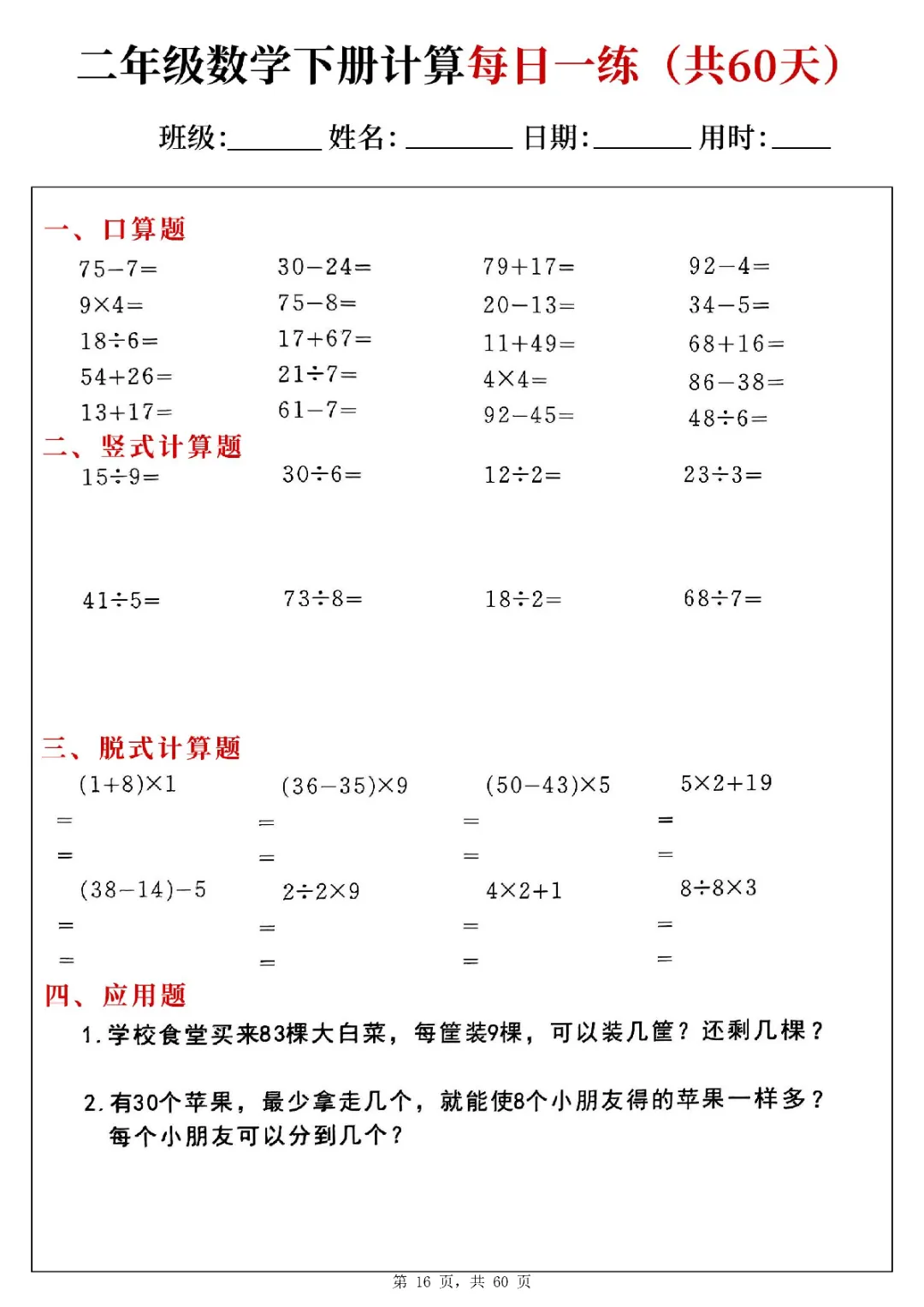 2026年二年级下册数学计算每日一练(电子版可打印)