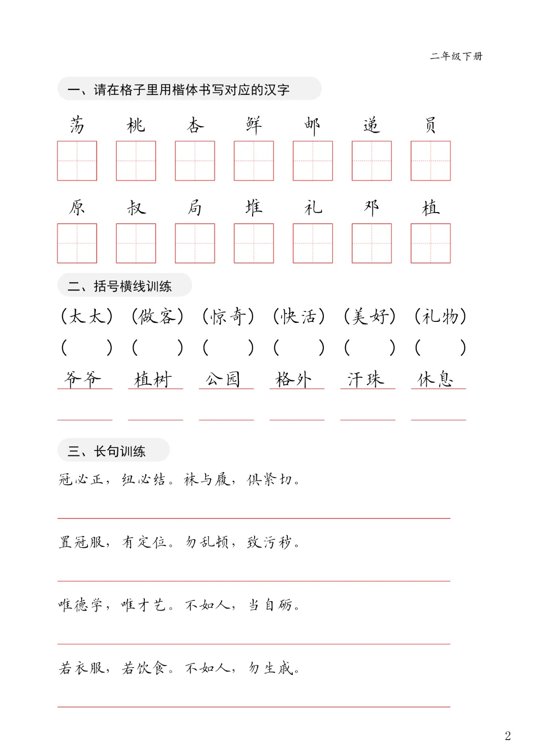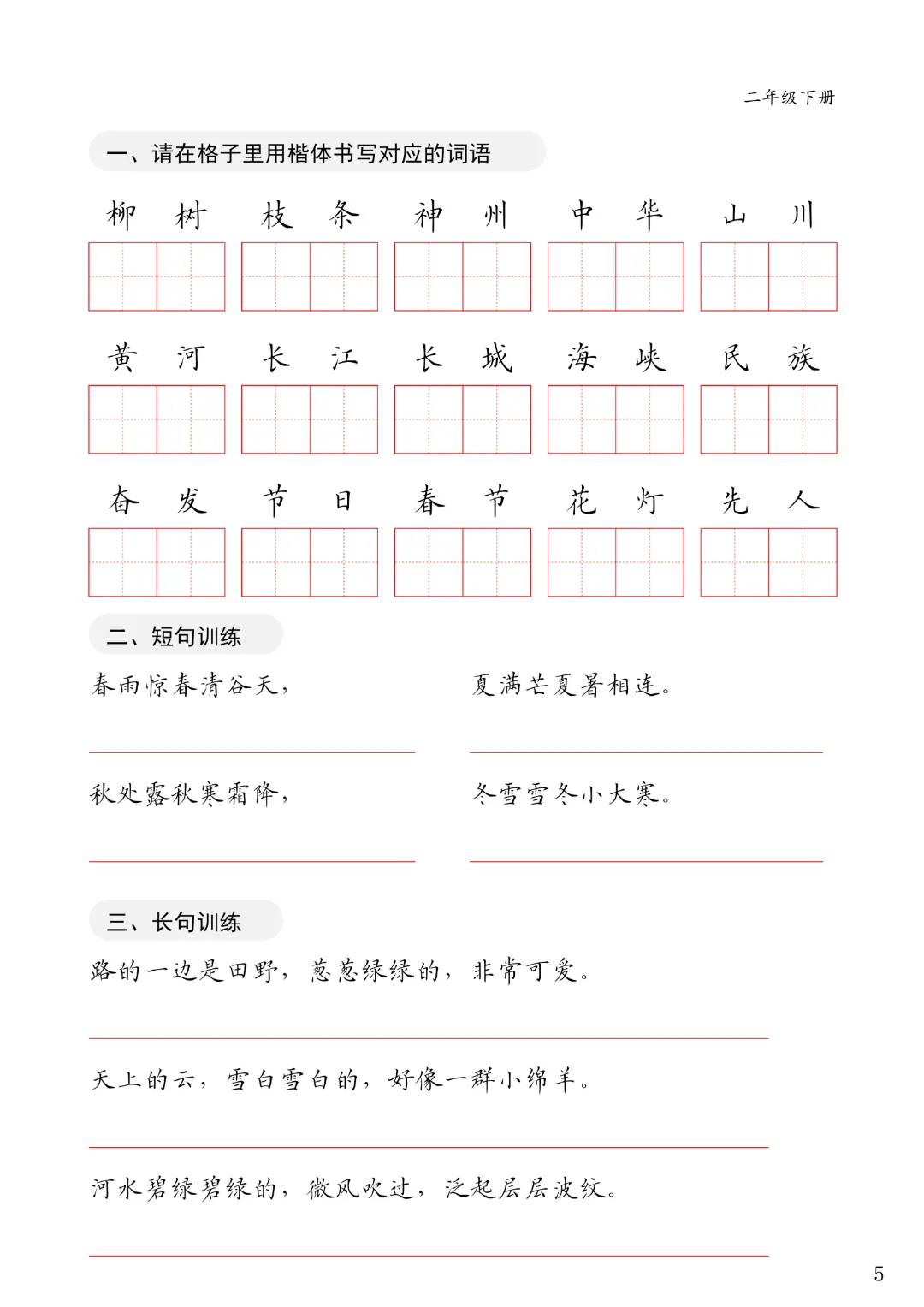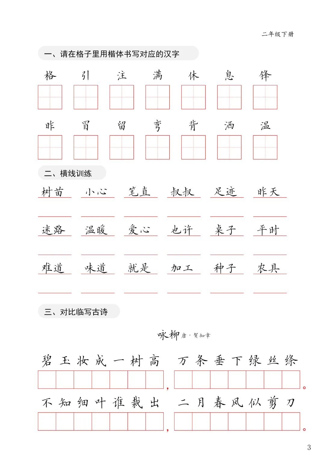 本字帖与二年级下册语文教材课文同步,紧扣生字教学要求,规范笔画笔顺与间架结构,帮助孩子夯实识字基础,养成良好书写习惯,提升书写美观度与卷面质量,是课内同步学习、日常练字的优质教辅。
