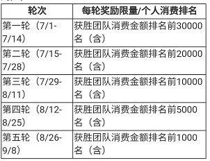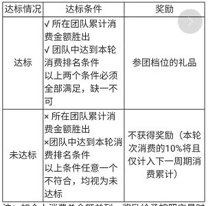 成功参团后(可选两队中任何一队)消费总金额较高的团队取胜,胜利团队中个人消费符合排名条件即可获赠对应礼品,未获得礼品的持卡人消费的10%计入下一轮消费累计。