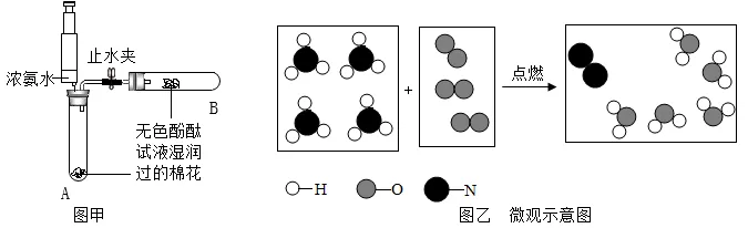 (1)如图甲所示,AB试管中各有一团用无色酚酞试液湿润过的棉花,实验前止水夹处于关闭状态。实验时,将少量浓氨水滴在A试管的棉花上,观察到棉花变红,说明氨水呈碱性。再打开止水夹,几秒钟后观察到的现象是_____________,说明氨气分子在运动。
