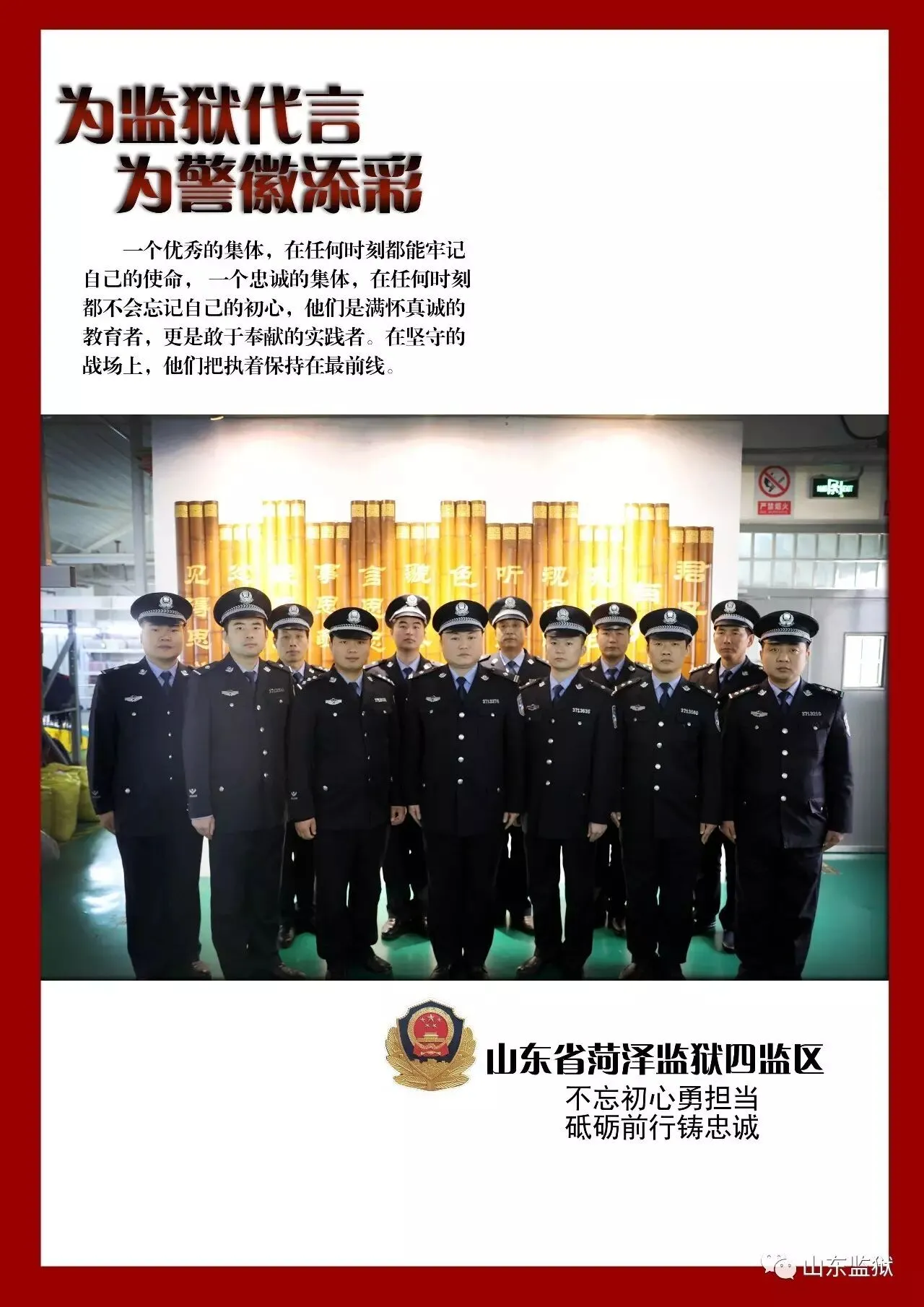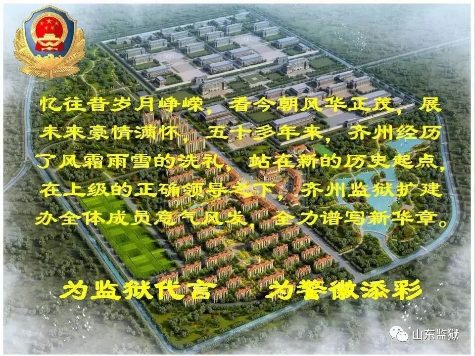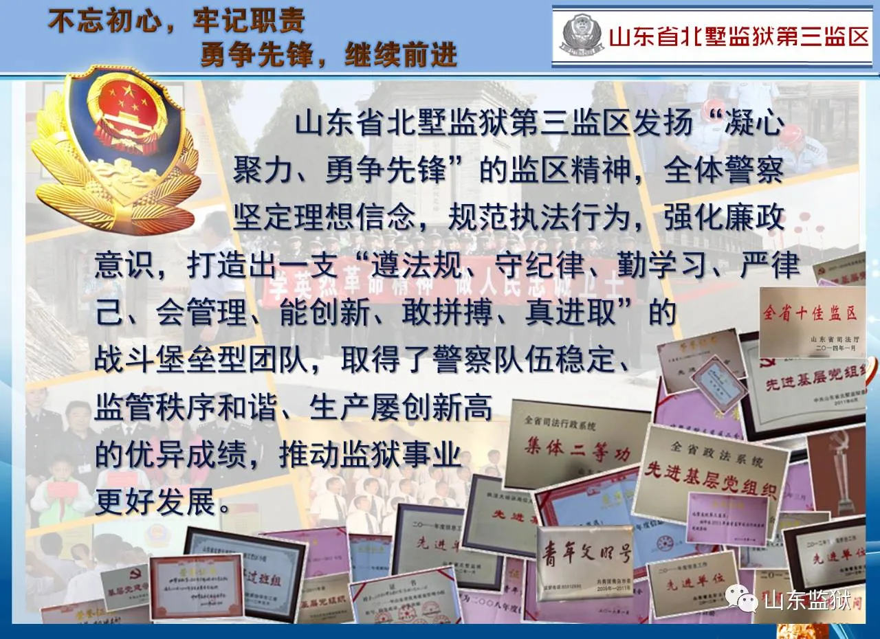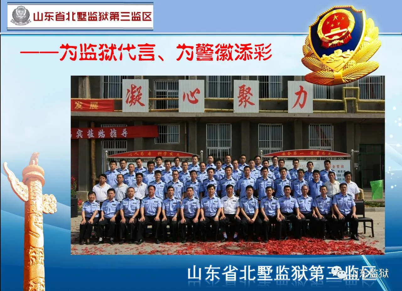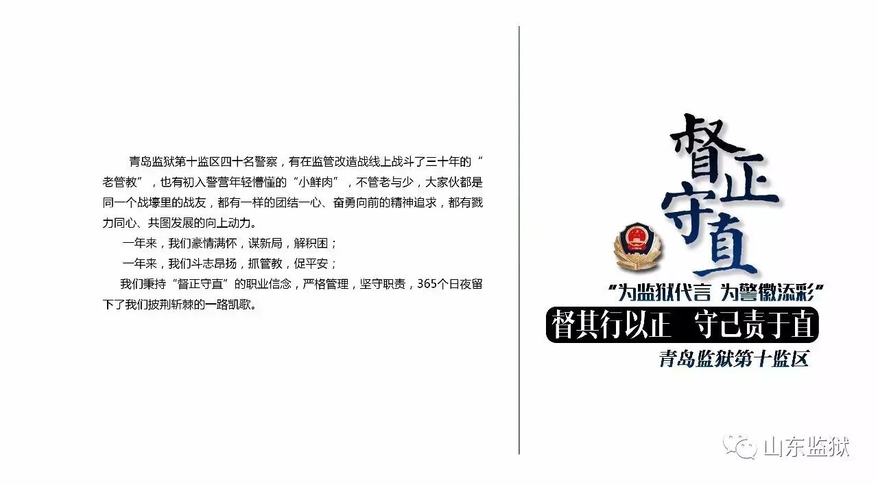 头顶警徽,肩担责任。我们带着激情与理想,投身国家刑罚执行的最前线。我们用坚实的臂膀,承担起平安山东、法治山东建设的重任。我们用美好年华,践行着创建安全文明现代监狱的使命。我们选择,我们热爱,我们自豪。我们为监狱代言,我们为警徽添彩,我们是山东监狱警察团队。