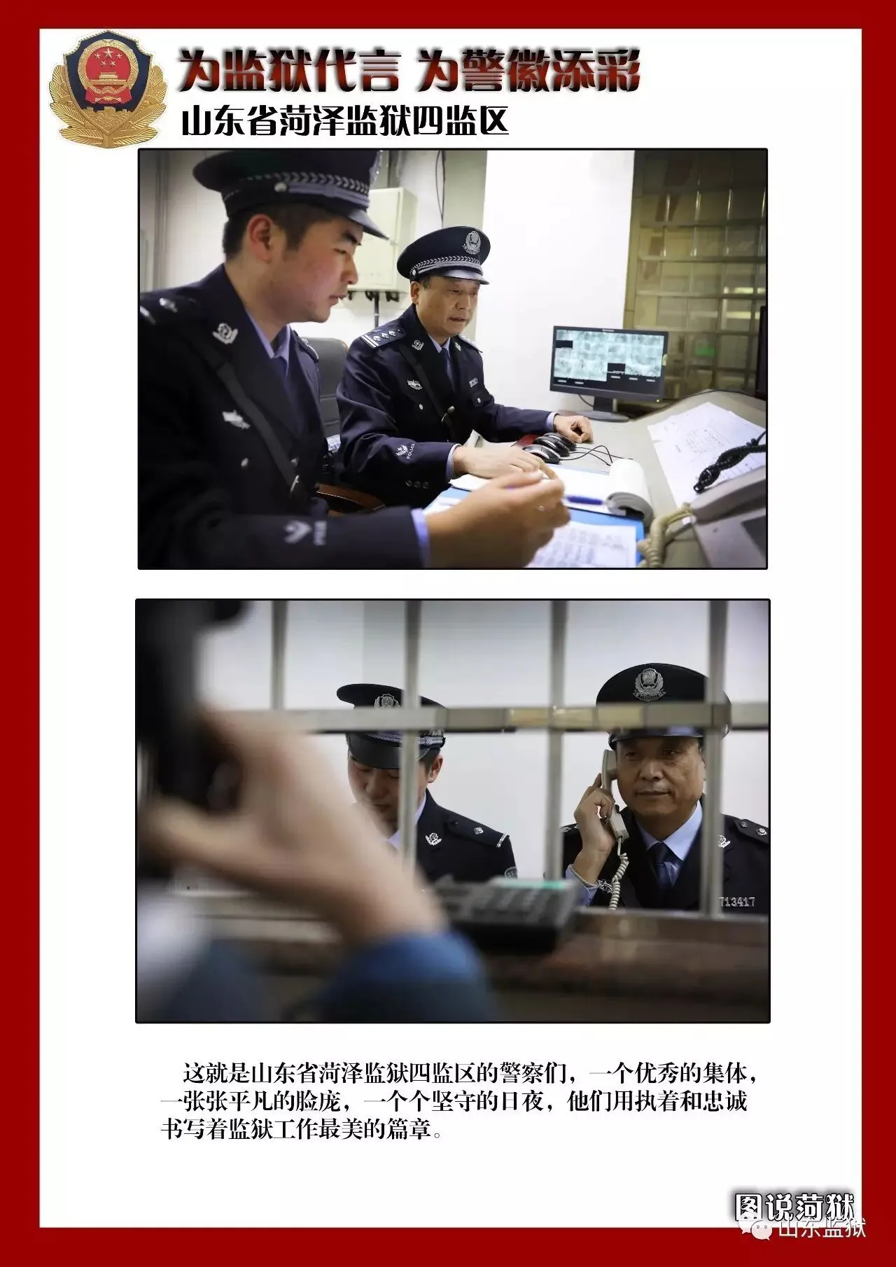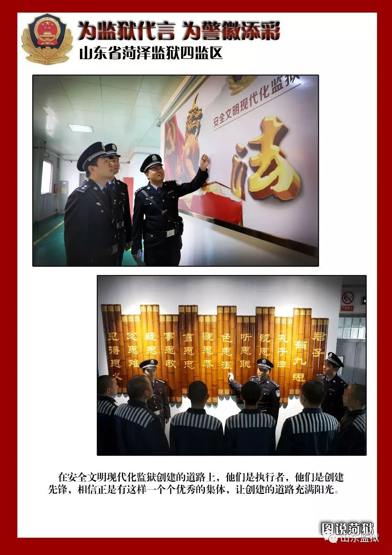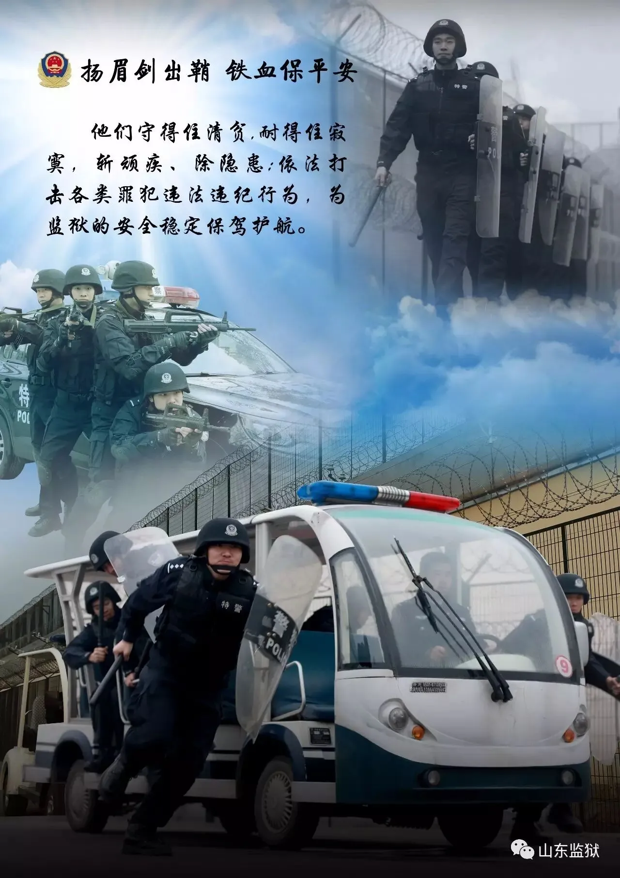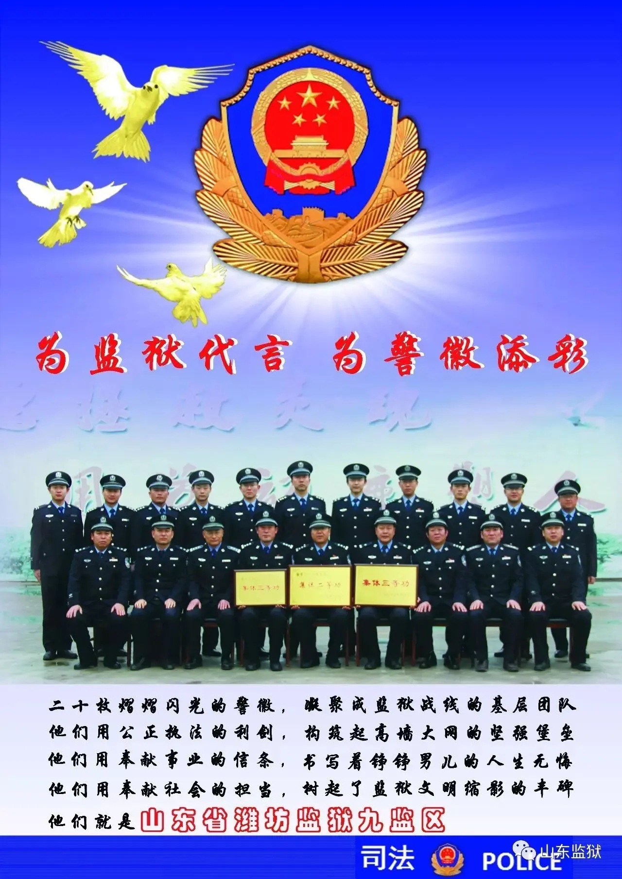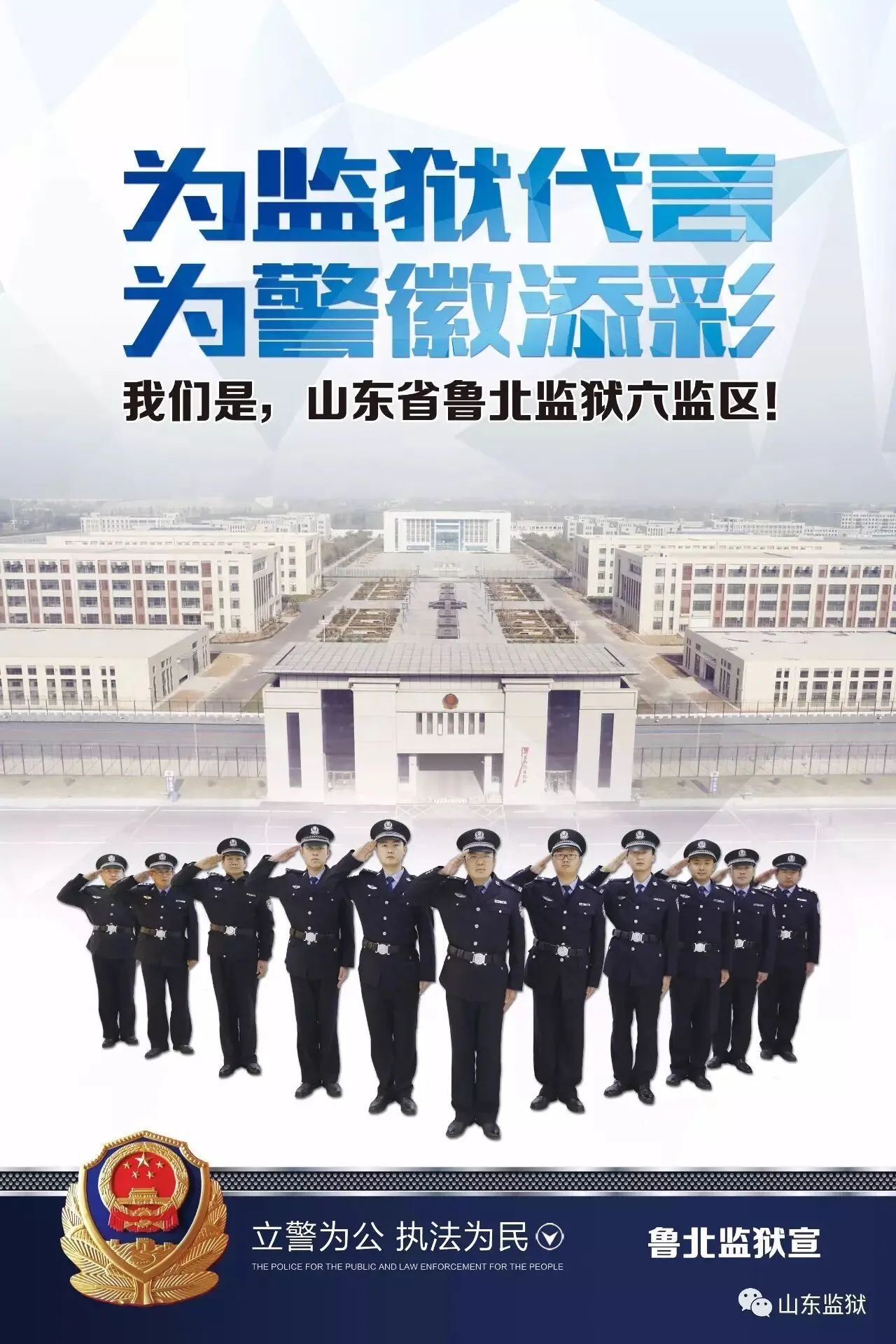 头顶警徽,肩担责任。我们带着激情与理想,投身国家刑罚执行的最前线。我们用坚实的臂膀,承担起平安山东、法治山东建设的重任。我们用美好年华,践行着创建安全文明现代监狱的使命。我们选择,我们热爱,我们自豪。我们为监狱代言,我们为警徽添彩,我们是山东监狱警察团队。
