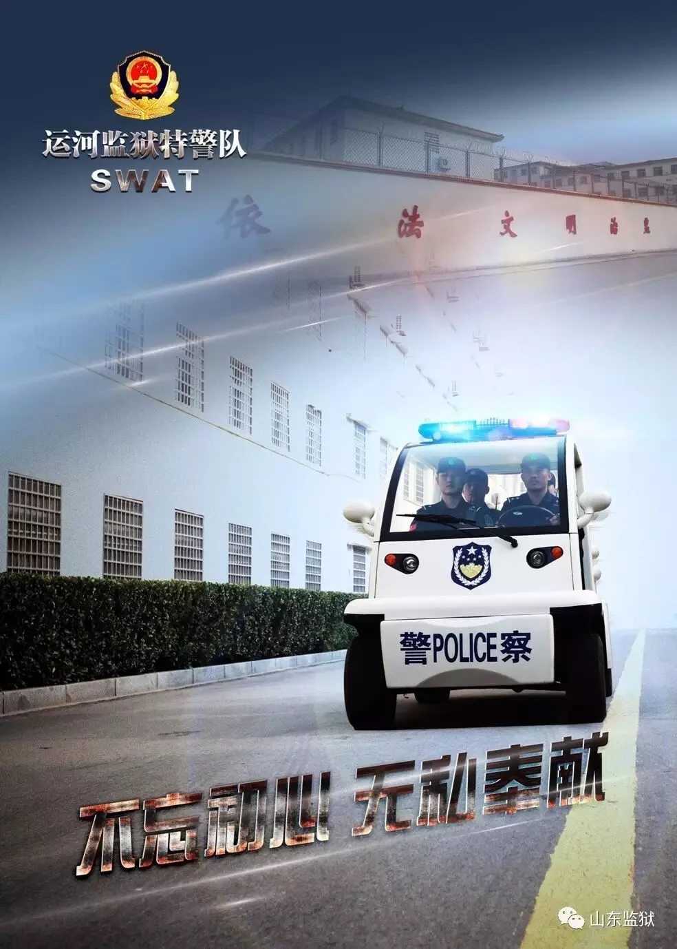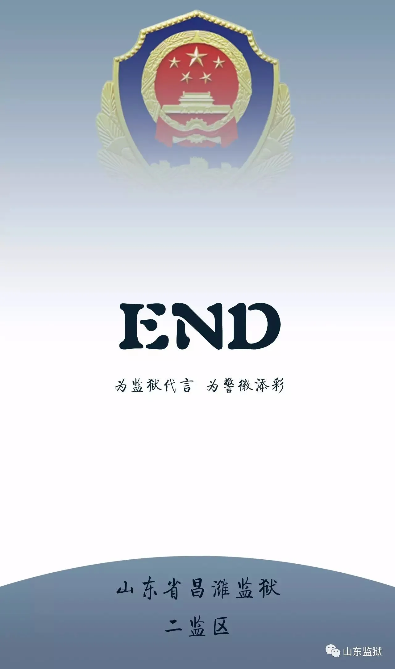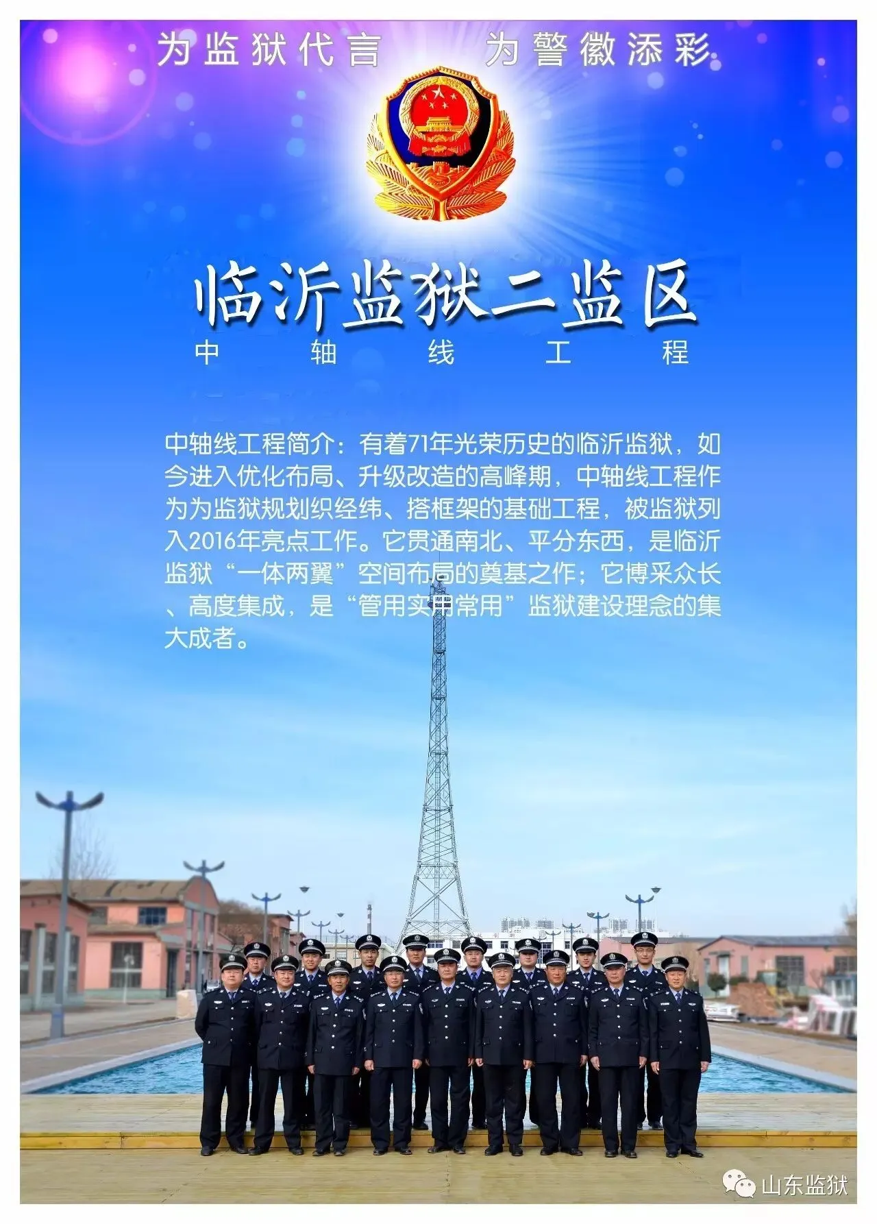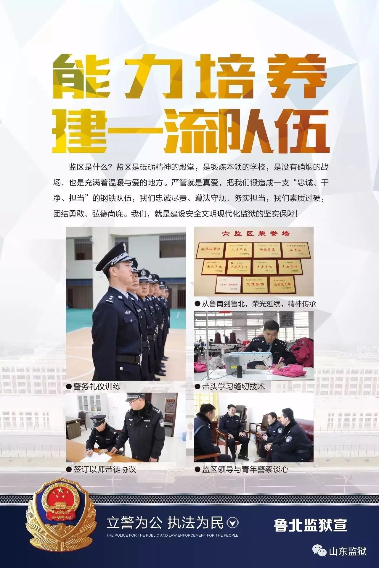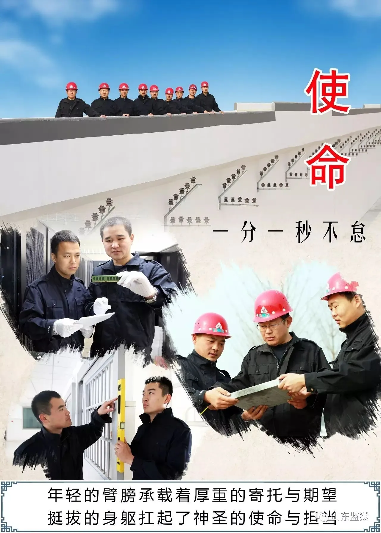 头顶警徽,肩担责任。我们带着激情与理想,投身国家刑罚执行的最前线。我们用坚实的臂膀,承担起平安山东、法治山东建设的重任。我们用美好年华,践行着创建安全文明现代监狱的使命。我们选择,我们热爱,我们自豪。我们为监狱代言,我们为警徽添彩,我们是山东监狱警察团队。