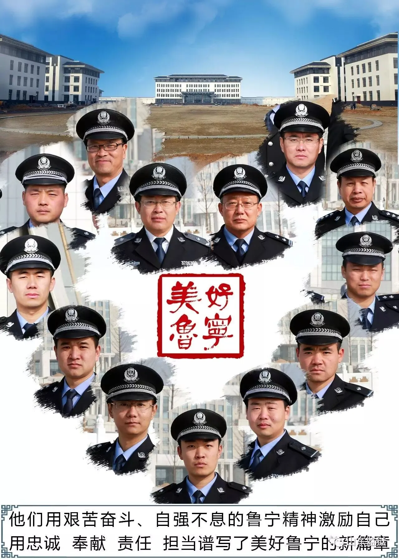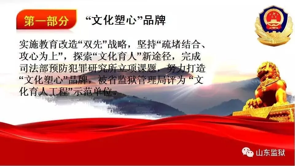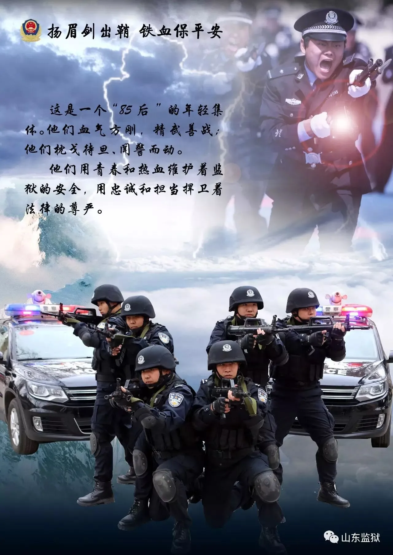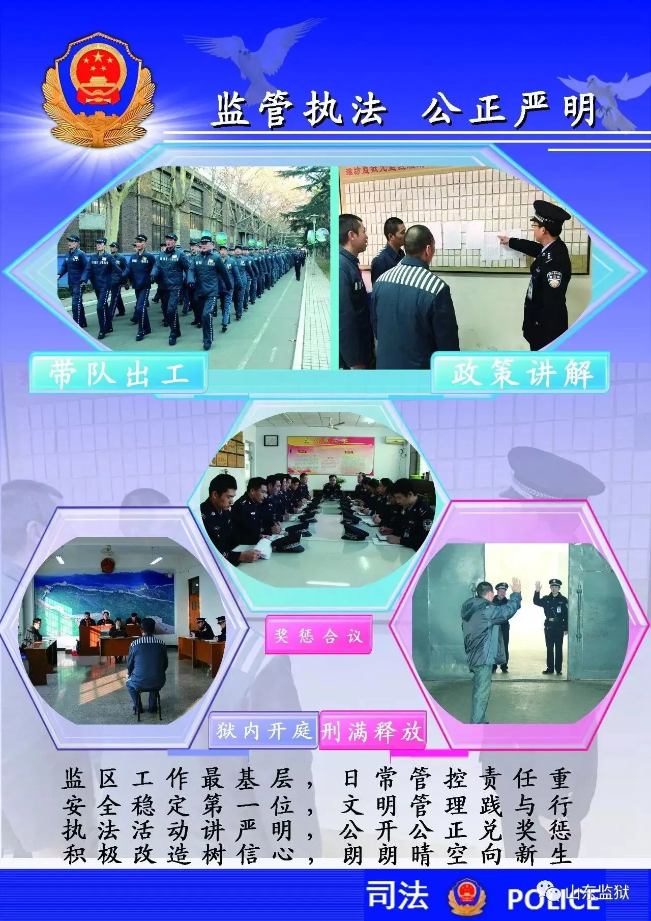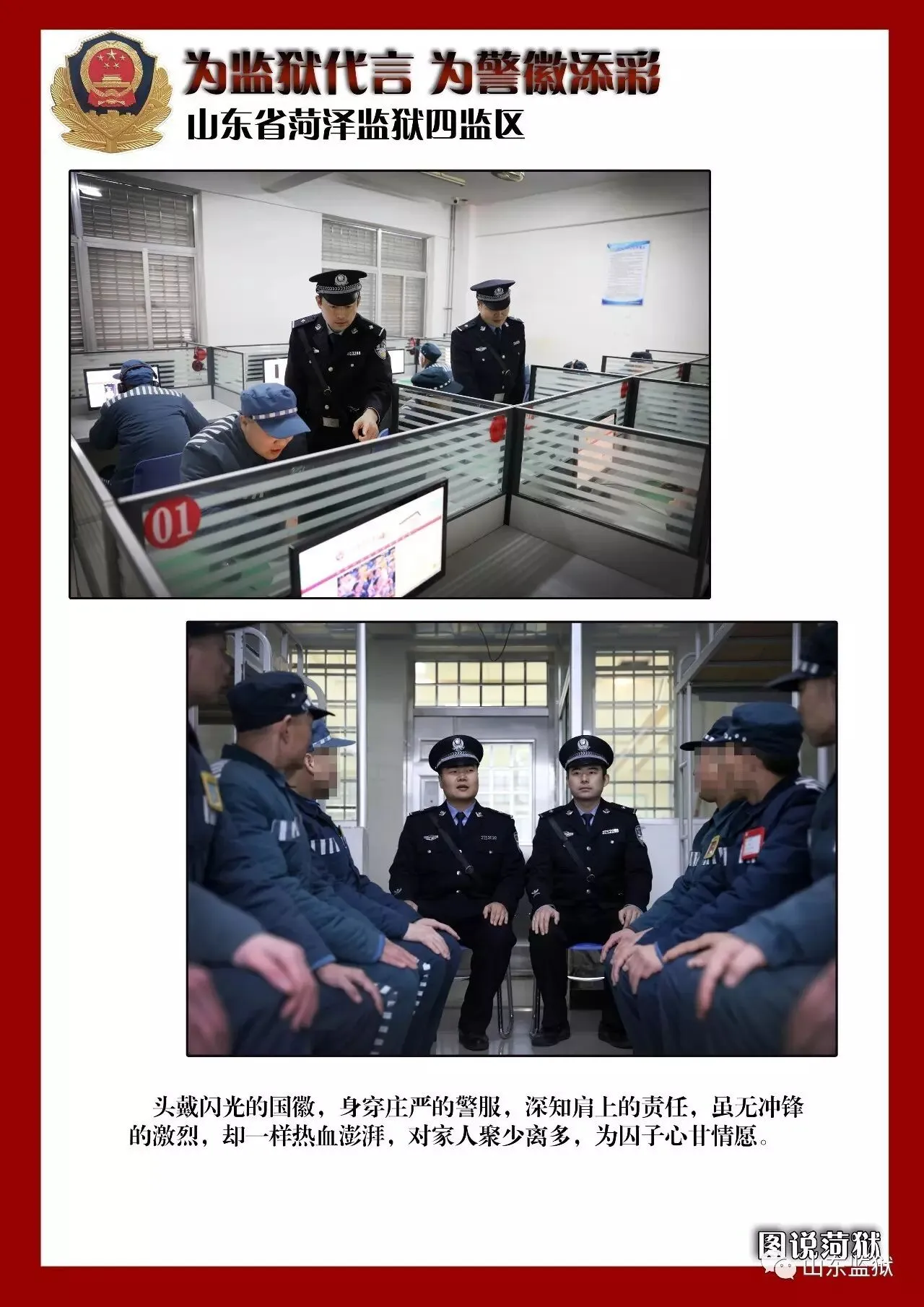 头顶警徽,肩担责任。我们带着激情与理想,投身国家刑罚执行的最前线。我们用坚实的臂膀,承担起平安山东、法治山东建设的重任。我们用美好年华,践行着创建安全文明现代监狱的使命。我们选择,我们热爱,我们自豪。我们为监狱代言,我们为警徽添彩,我们是山东监狱警察团队。