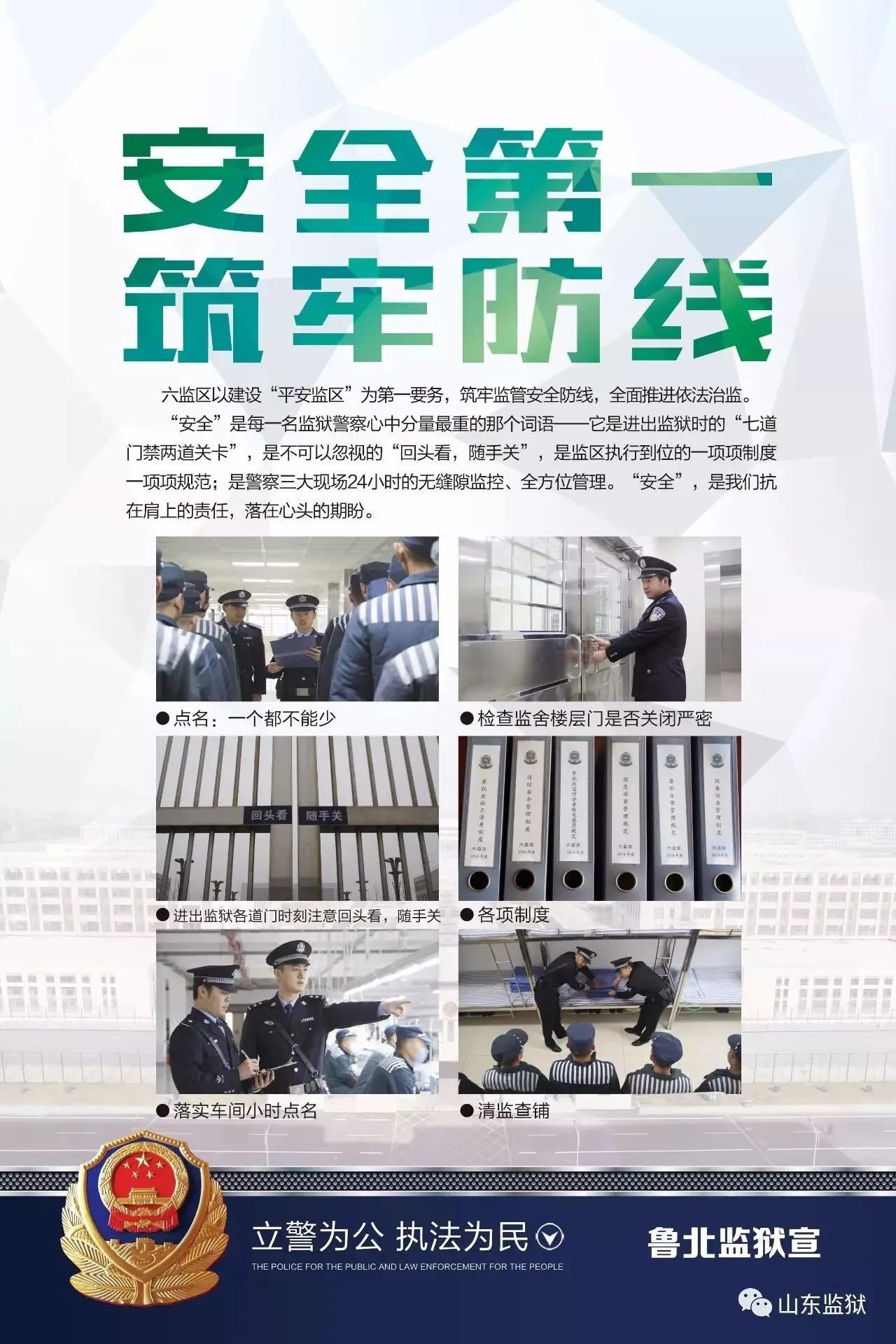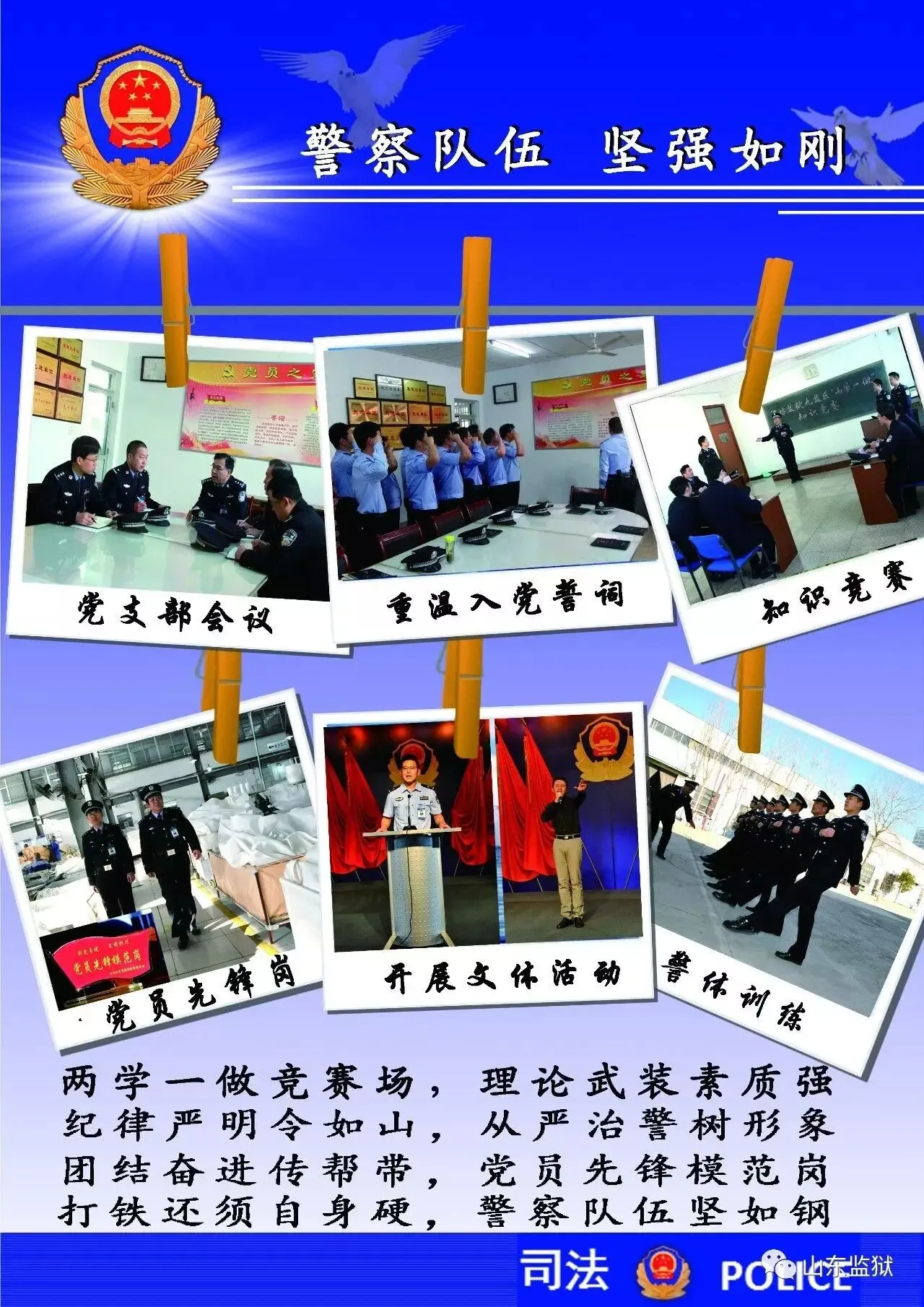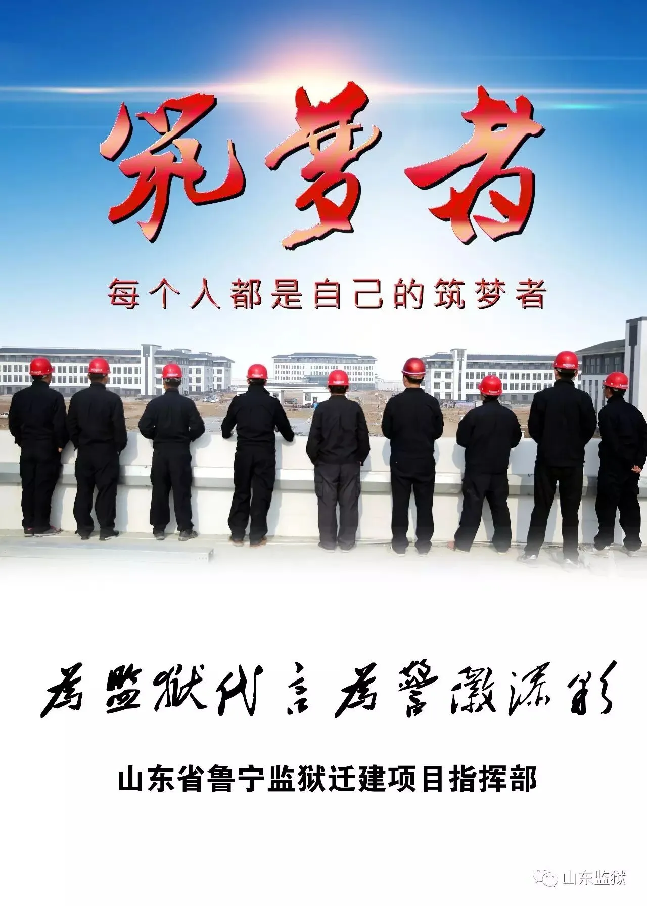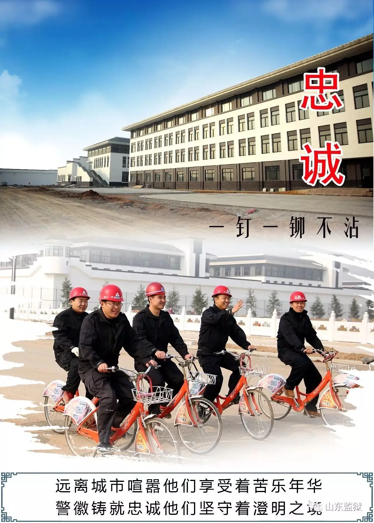 头顶警徽,肩担责任。我们带着激情与理想,投身国家刑罚执行的最前线。我们用坚实的臂膀,承担起平安山东、法治山东建设的重任。我们用美好年华,践行着创建安全文明现代监狱的使命。我们选择,我们热爱,我们自豪。我们为监狱代言,我们为警徽添彩,我们是山东监狱警察团队。