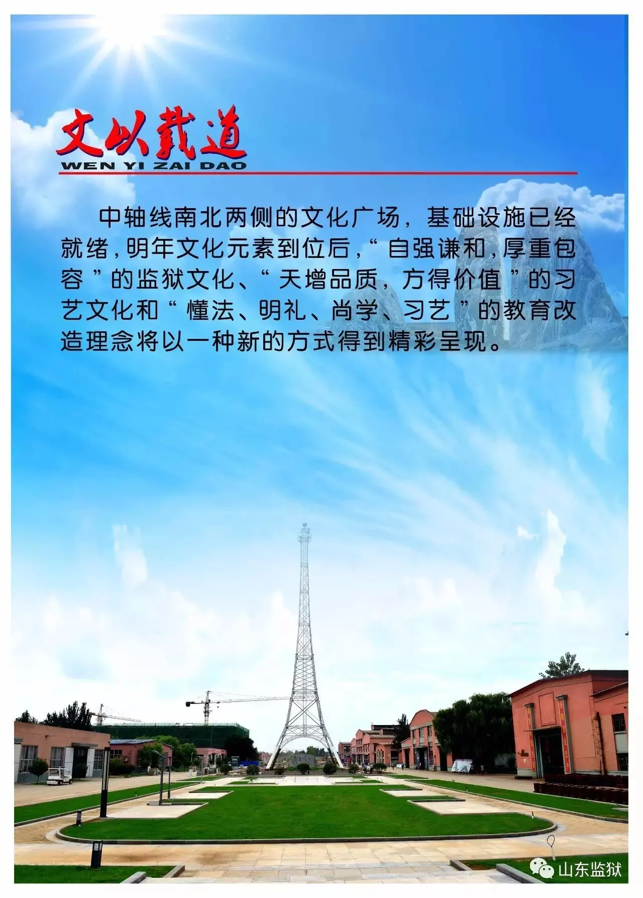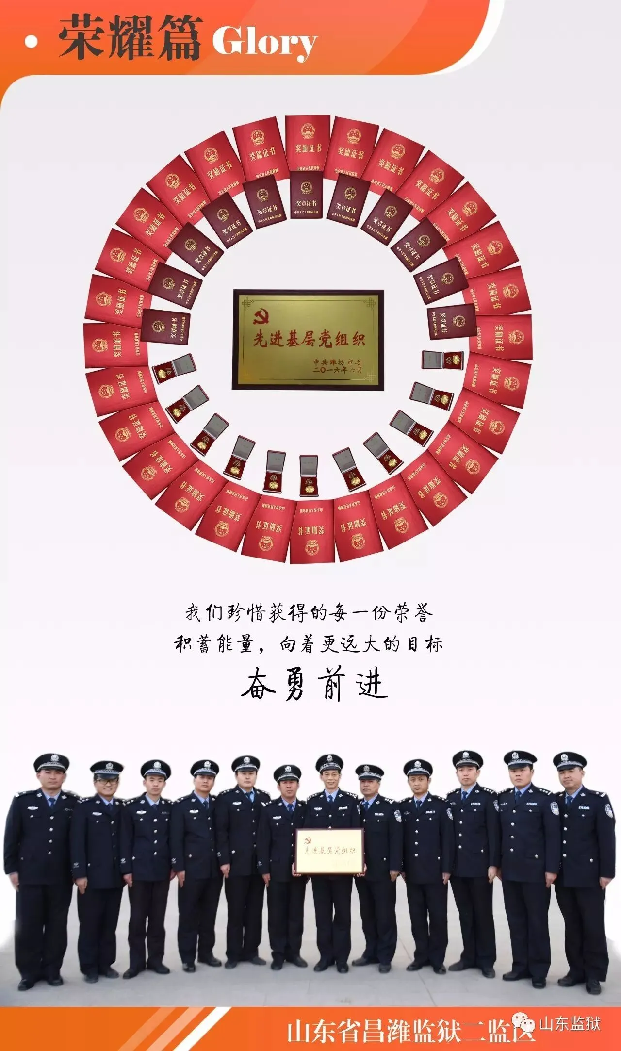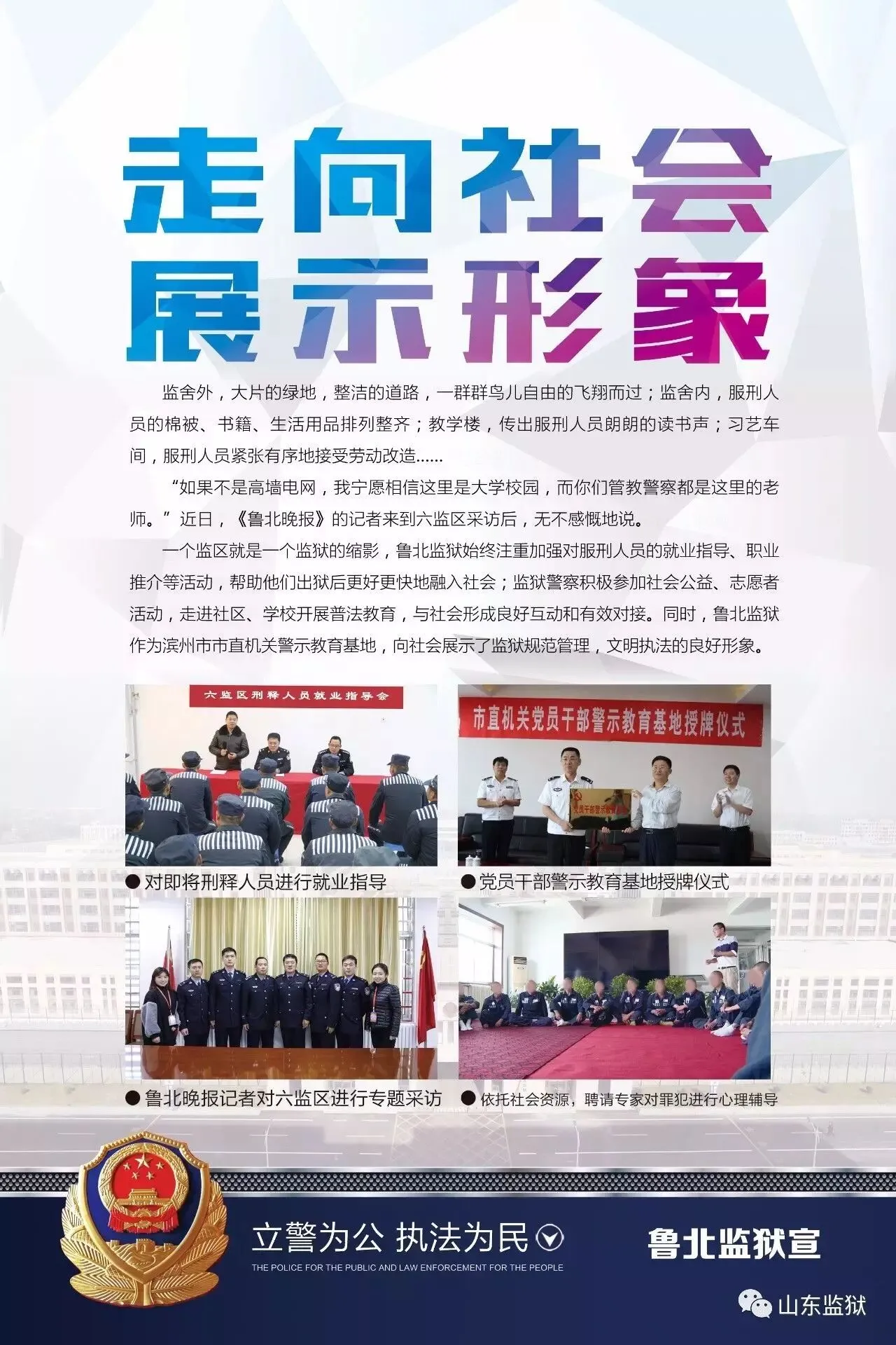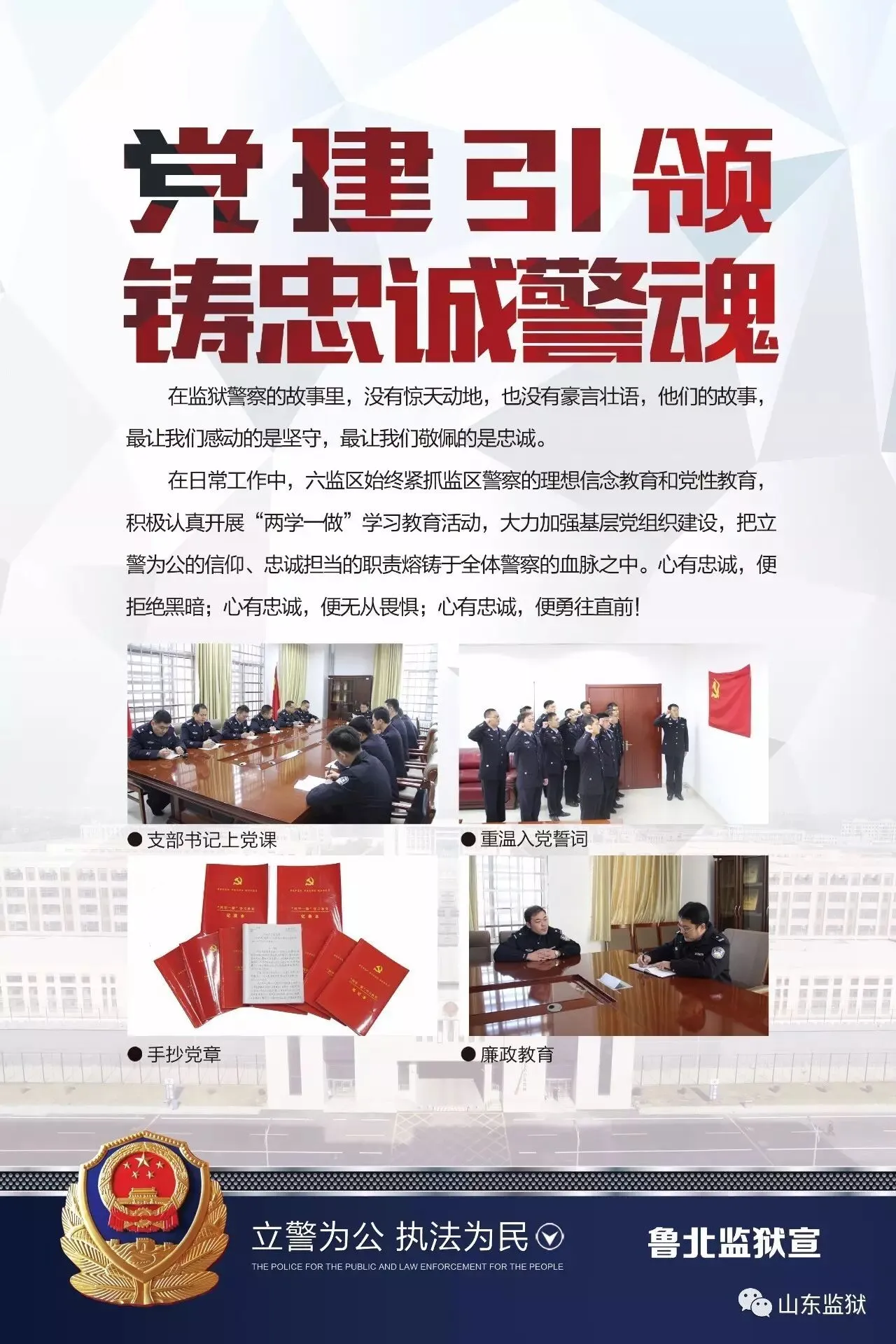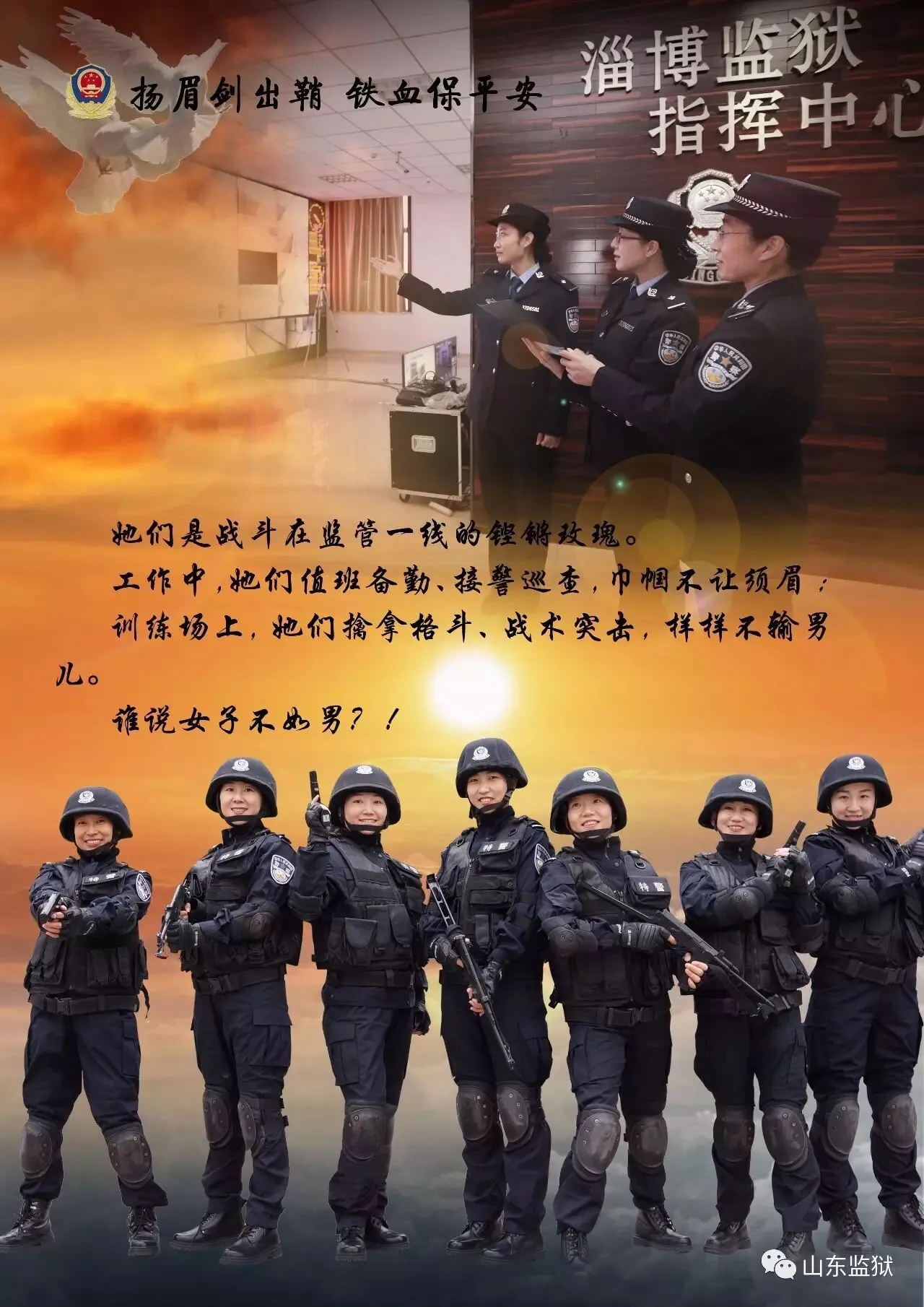 头顶警徽,肩担责任。我们带着激情与理想,投身国家刑罚执行的最前线。我们用坚实的臂膀,承担起平安山东、法治山东建设的重任。我们用美好年华,践行着创建安全文明现代监狱的使命。我们选择,我们热爱,我们自豪。我们为监狱代言,我们为警徽添彩,我们是山东监狱警察团队。