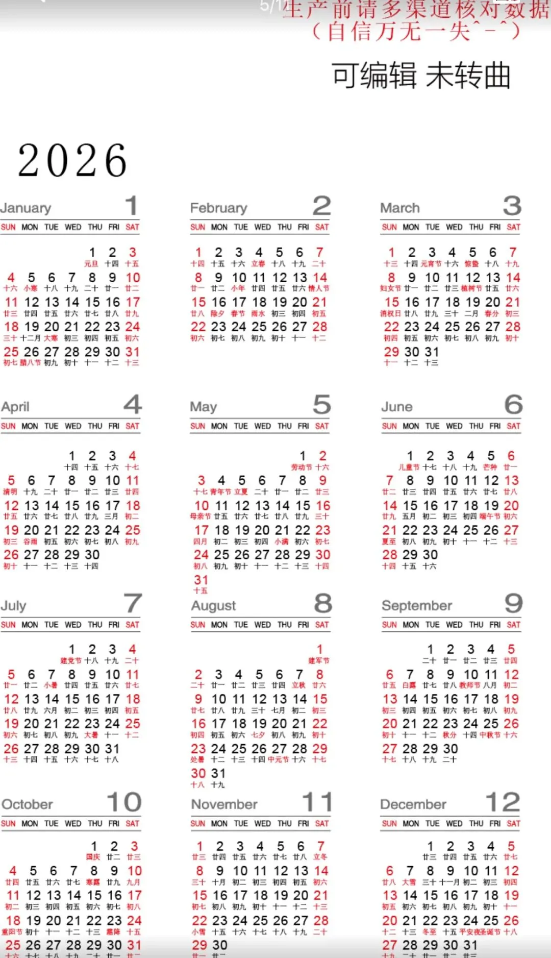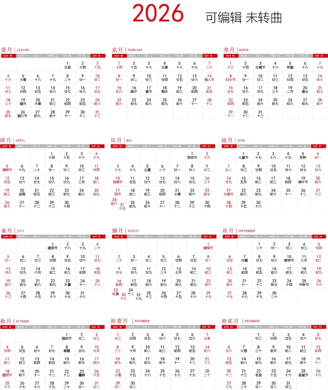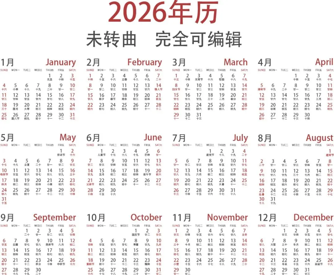 免费下载!最新2026全年高清日历台历表电子版excel可打印