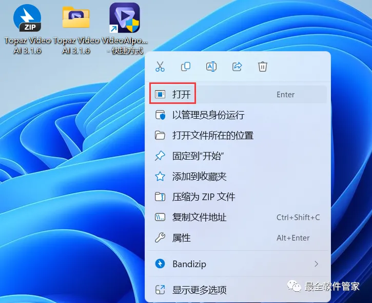 6、回到桌面,右键桌面上的【VideoAIportable软件图标】,点击【打开】