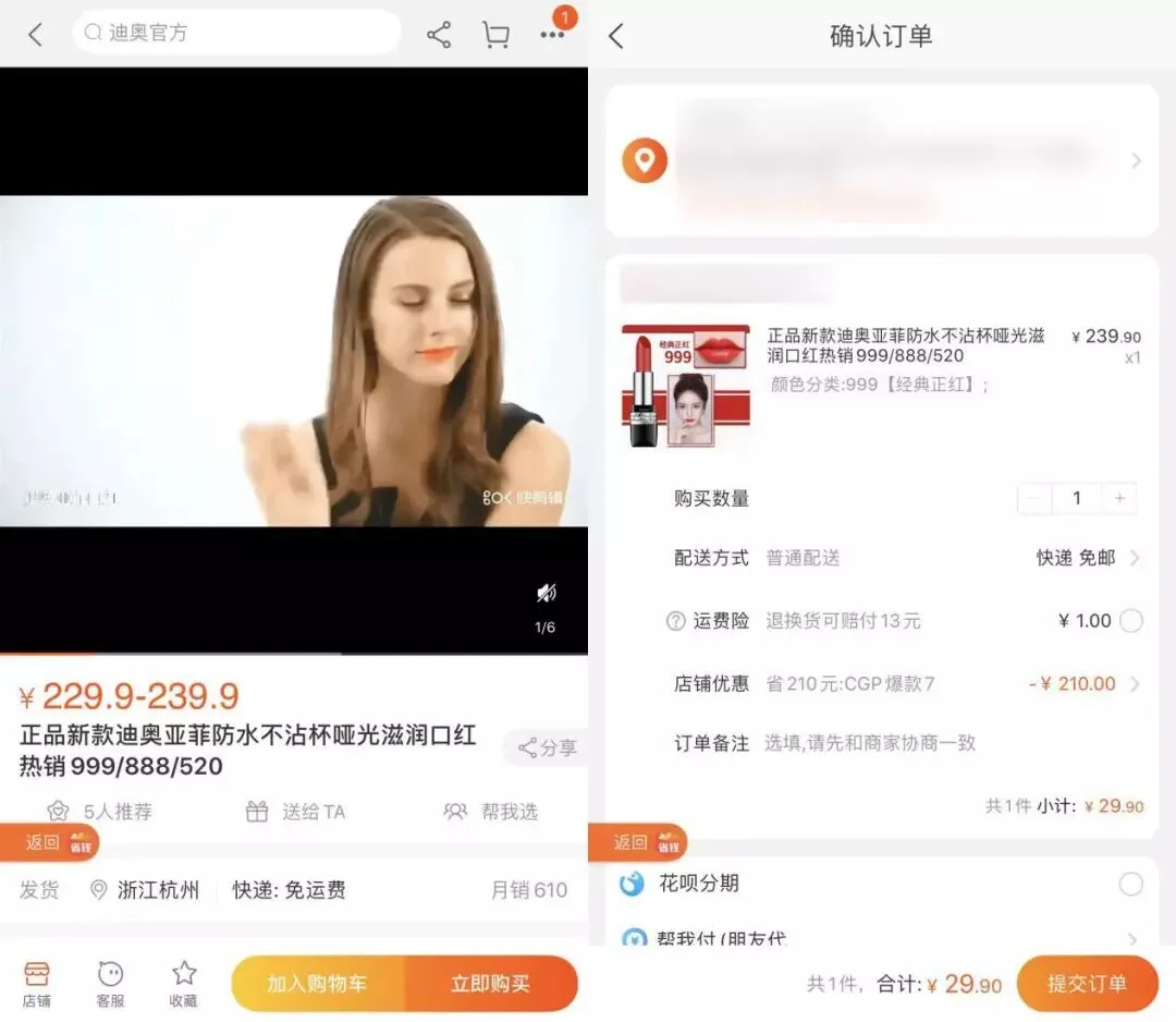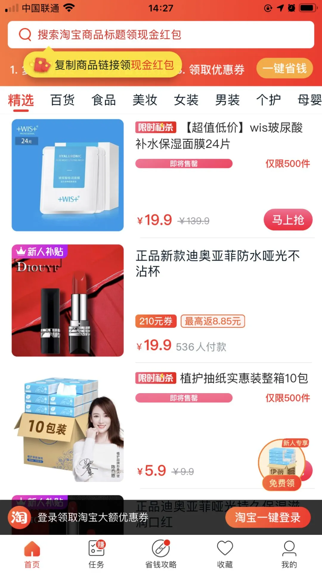 别急再往下看,滑动页面,下方多出了许多商品信息,19.9元的面膜、迪奥口红什么的就摆在眼前。