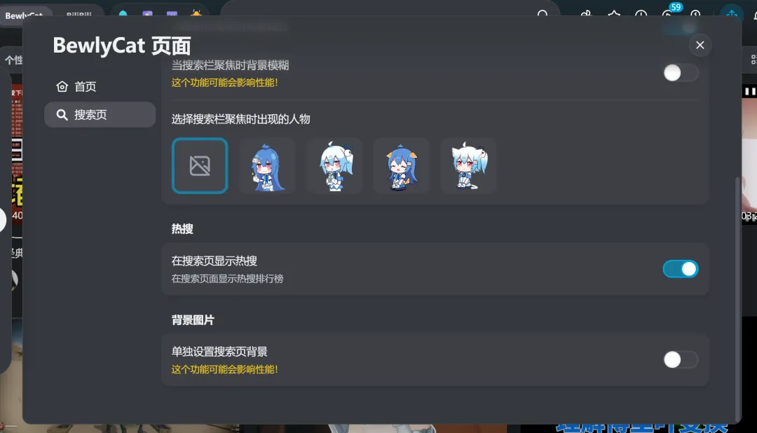 搜索页面的自定义功能也在这里。可以改Logo发光、显示热搜内容、调整搜索页背景。