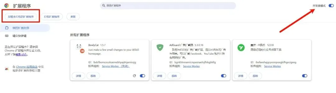 3、Chrome浏览器-「拓展程度」-打开右上角「开发者模式」,点击左侧的「加载未打包拓展程序」,找到解压缩后的文件,导入即可。