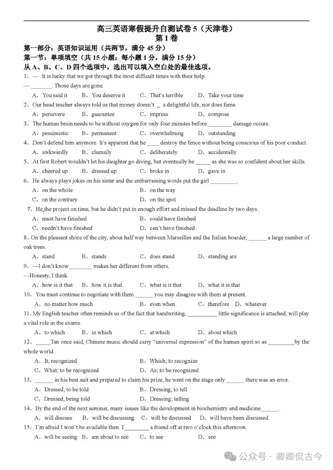 【可打印】高三英语寒假提升自测试卷5(天津卷)(附解析) 点击上方“蓝字”免费关注! 本套试卷+答案解析下载入口 关注“卿卿侃古今”公众号 点击左下角阅读原文可下载 相关链接: 【可下载】2025-2026年高中英语试题汇总(附解析)【持续更新中】 【可下载】高三英语上学期期末试题16套(附解析) 【可下载】高二英语上学期期末试题10套(附解析) 【可下载】高一英语上学期期末试题汇9套(附解析) 【可下载】2025-2026学年度高一高二高三开学考试模拟试卷(天津专用)(附解析) 新外研版高中英语高清电子课本、课文原文和译文、单元同步复习资料和试题【持续更新中】 【可下载】2025-2026单选综合训练150题 【目录1】高中英语阅读理解限时训练大全(持续更新中~) 【目录2】高中英语完形填空限时训练大全(持续更新中~) 【目录3】高中英语书面表达大全(持续更新中~) 【目录4】高中英语听力训练大全(持续更新中~) 【目录5】高中英语单选题大全(持续更新中~) 【目录6】高中英语语法题大全(持续更新中~) 【目录7】高中英语阅读表达题大全(持续更新中~) 【目录8】科普知识汇总 【目录9】中高考学法知识汇总 【目录10】高考英语真题+名校模拟真题+月考和期中期末试题(持续更新中~) 【目录11】暑期高考英语备考资料大全持续更新中~【汇总】中高考志愿填报资料大全 【汇总】高中英语月考和期中期末试题(持续更新中~) 【汇总】2025届高三英语一模试题(附解析) 【汇总】2024届高三英语一模二模三模试题(附解析) 【汇总】2024届高考英语押题卷(附解析) 【汇总】2025届高三英语周考综合练(附解析) 【题库】高三英语限时训练(持续更新中~) 【题库】高三英语试题汇编(持续更新中~) 【题库】高二英语试题汇编(持续更新中~) 【题库】高一英语试题汇编(持续更新中~) 【真题】2007-2024年天津市高考英语真题(持续更新中~) 【真题】2011-2023年天津高考英语听力真题在线测试 【模拟】2025届高三英语听力机考模拟试题在线测试 【高考词汇】(新)外研版高中英语全七册词汇表(附音频) 【中考词汇】初中英语外研版必备单词表(完整版),可打印 建议收藏保存 点击阅读原文查更多