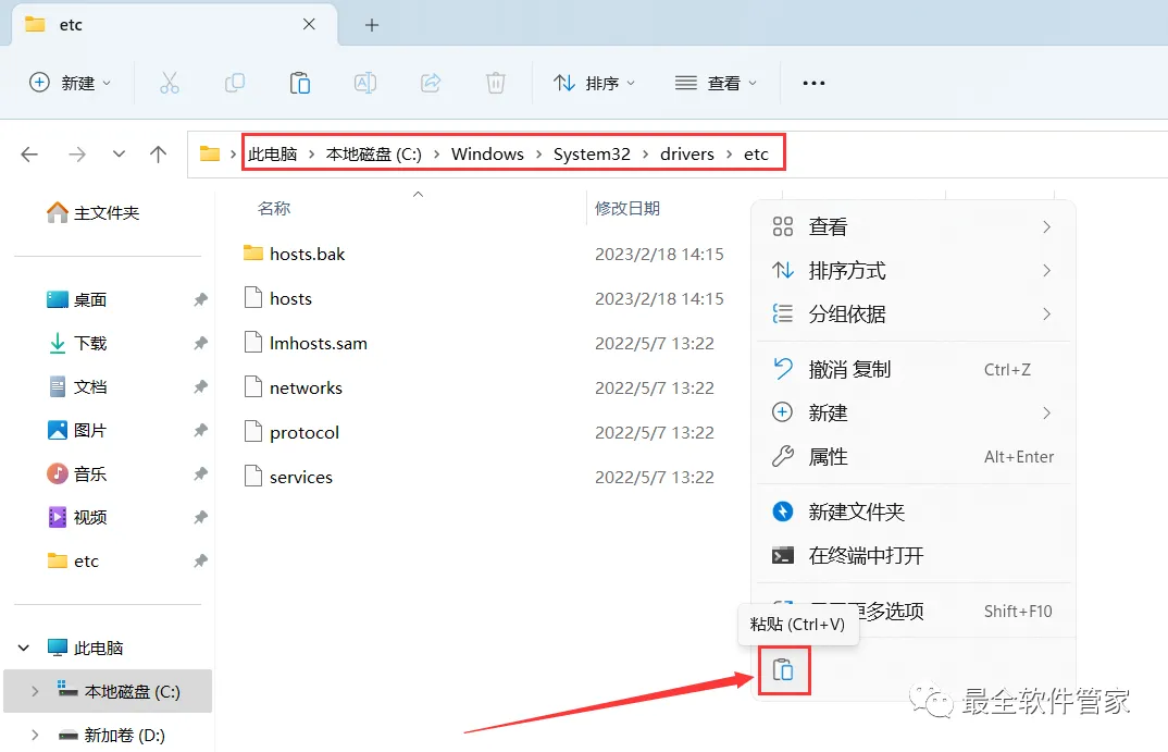 17、回到路径文件夹:C:/Windows/System32/drivers/etc,右键文件夹的空白处,点击【粘贴按钮】
