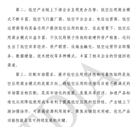 第三,匹配市场需求、提升低空应用经济性和可靠性始终是低 空应用商业模式的发展方向。将低空应用的优势与目前不被满足的 市场需求相匹配,是其市场化的前提。发展共享经济、加速产品标 准化从而降低使用成本有利于提高低空应用的经济性。产业链上下 游加强协作,可提高资源利用效率。聚焦关键技术突破,优化产品功能性能是其可持续发展的关键。