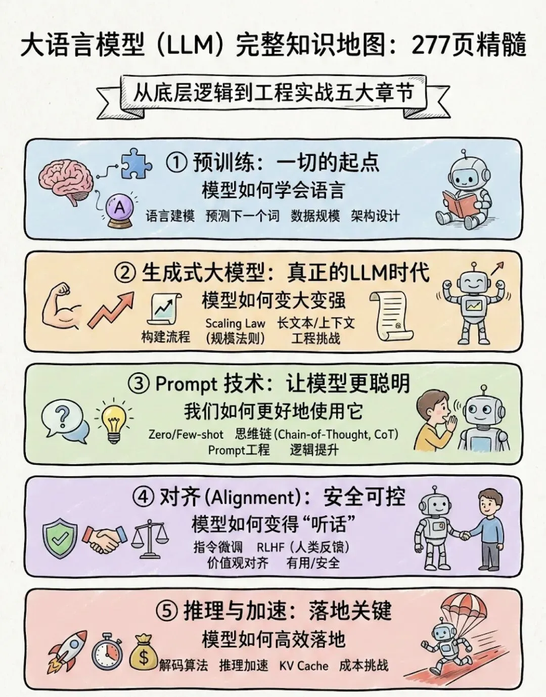 它覆盖了:理论基础、训练机制、应用方法、安全对齐和工程优化。