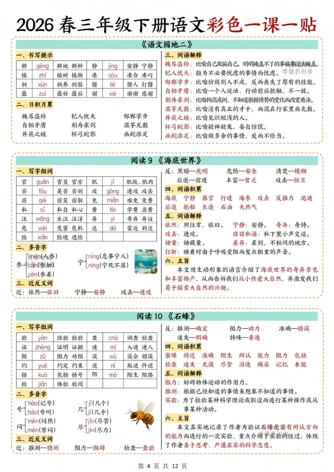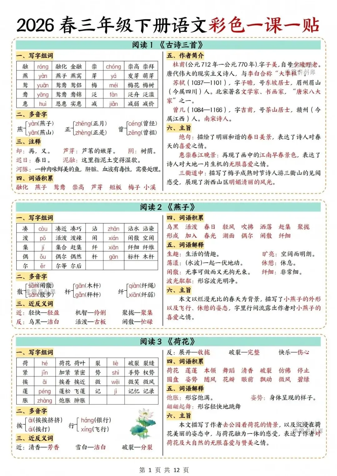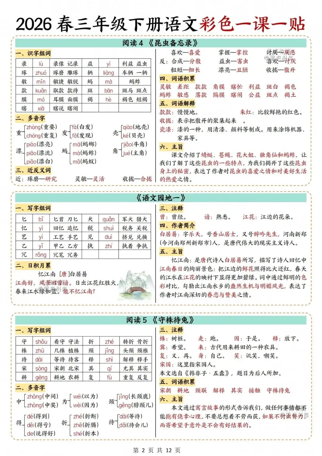 2026春人教部编版三年级下册语文《重要知识点汇总・课课贴》(彩色版)| 完整可打印 大家好,我是陈佳妈妈,今天分享的是 2026春人教部编版三年级下册语文《重要知识点汇总・课课贴》(彩色版)| 完整电子版可打印 (温馨提示;因篇幅有限,仅展示部分内容。 (文末有完整版电子版领取方式) 完整电子版: ①:在公众号对话框中回复:2245 (不是在“留言”中发数字)