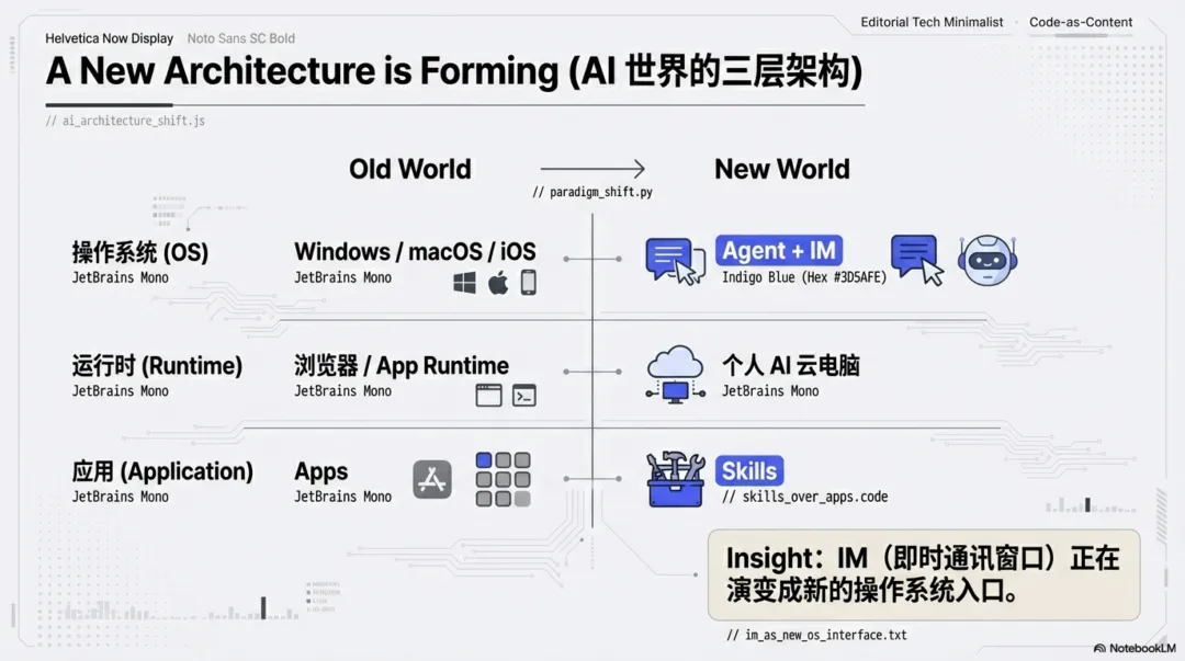 但这几天天晚上躺床上的时候,脑子里一直在转这个框架。越想越觉得,它把我最近观察到的很多零散变化串起来了——为什么IM在变成操作入口,为什么开发者开始做Skill或者Agent,而不是App。