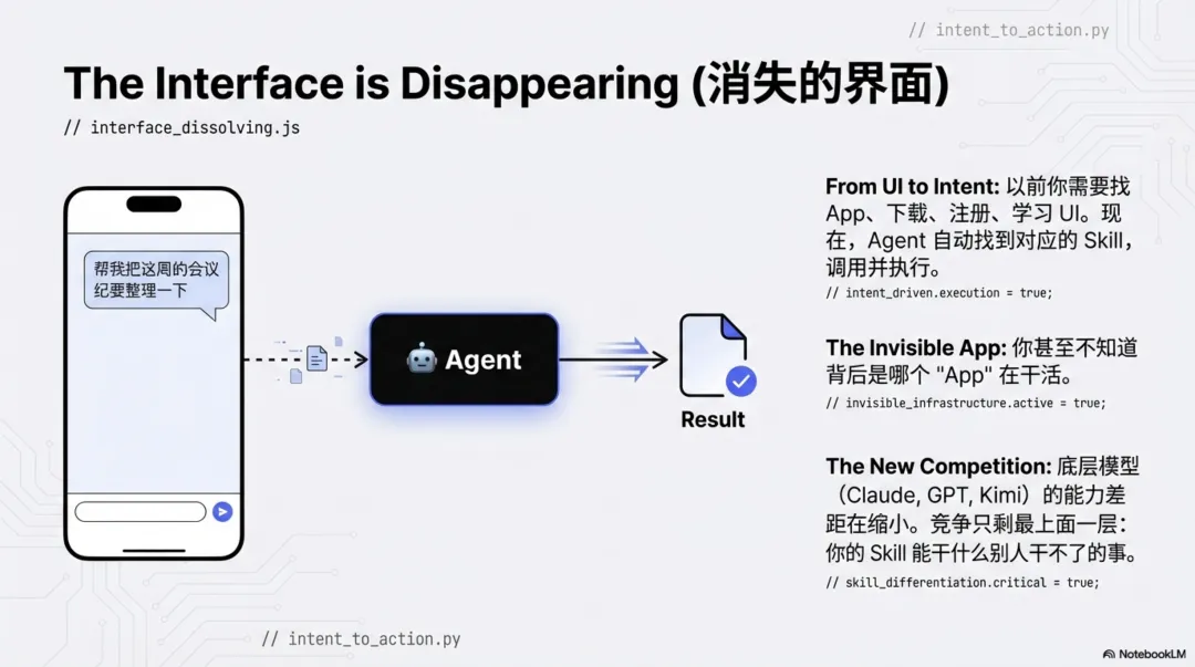 那篇闭门会的文章里面的讨论,有人说得很直白:”未来绝大多数产品都会Agent化或者 Skill化。开发者不再需要维护UI界面,只需要提供能力,做好被发现、被调用的机制。”
