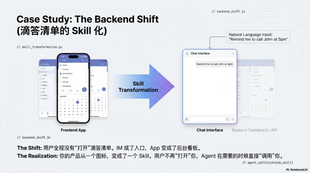 想想看,你的产品从一个App图标,变成了一个Skill。用户不再”打开”你,Agent在需要的时候直接”调用”你。