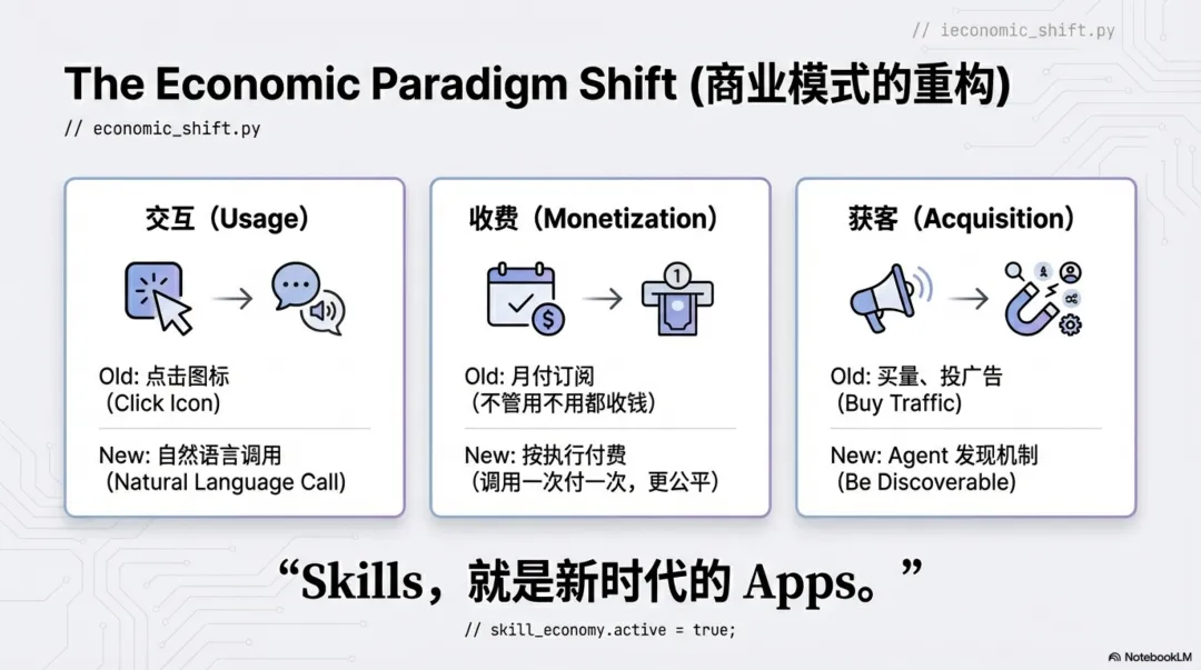 收费也变了。以前做App,用户订阅每月付费,不管用不用都收钱。我手机上那些App,有多少在收我订阅费但我根本没打开过?Agent调用Skill的逻辑是按执行付费,调用一次付一次,没调用不收钱。对用户更公平,但你的Skill得真的好用,不然没人反复调用。