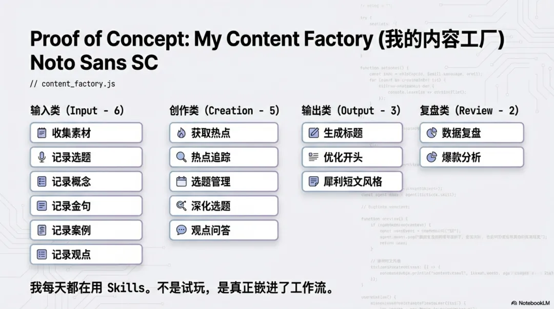 我在Claude Code(主要是这套内容工厂里面)里沉淀了16个Skill: