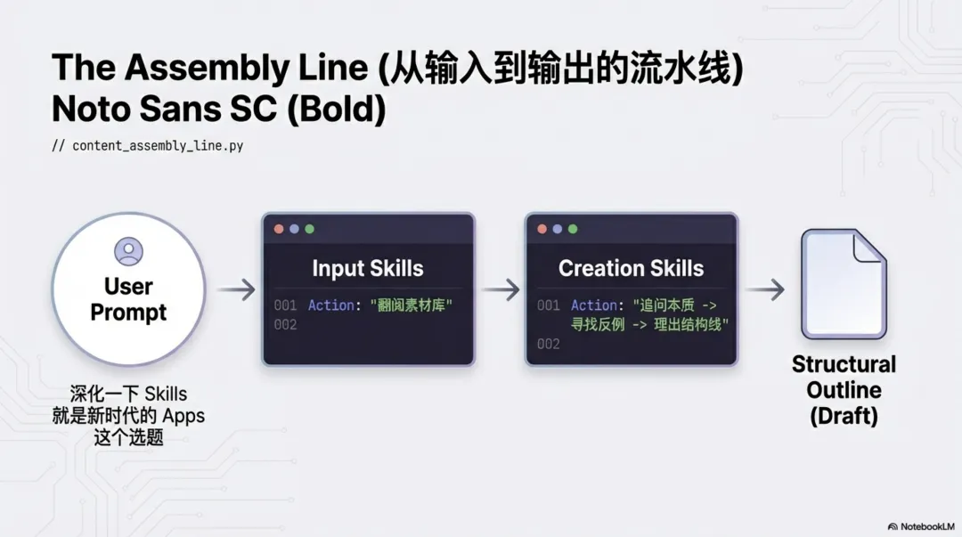 拿”深化选题”说。我写这篇文章的时候,跟Claude Code说”深化一下Agents和Skills就是新时代的Apps这个选题”。它先去我的素材库里翻相关的概念、案例,然后用九个维度追问:本质是什么?谁会反对?有什么反例?最后帮我理出了这篇文章的结构线。