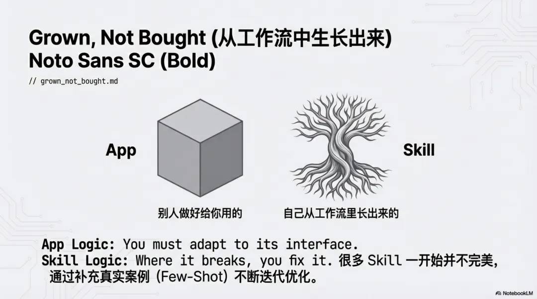 Agent(或者Skill)和App的区别就在这:App是别人做好给你用的,Agent(Skill)是你自己从工作流里长出来的,哪里不对改哪里。