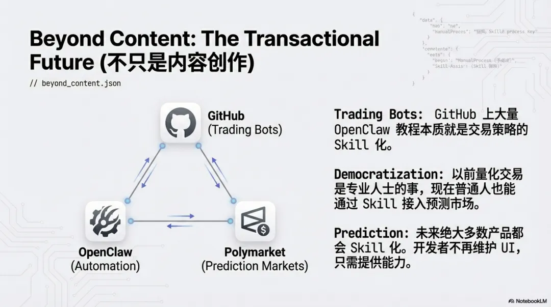 你去GitHub上搜一下,大量用OpenClaw搭建交易Bot的教程,本质就是把交易策略Skill化。以前做量化交易是专业人士的事,现在有人用Agent(Skill)接入Polymarket这类预测市场,普通人也能跑策略了。OpenClaw能传播这么广,交易场景是一个很大的推动力。