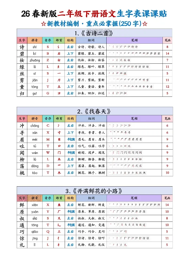26春新版二年级下册语文生字表课课贴 pdf电子版 「26春新版二年级下册语文生字表课课贴.pdf」 链接:https://pan.quark.cn/s/76ecf376f1a1 点击“阅读原文”下载完整PDF电子版