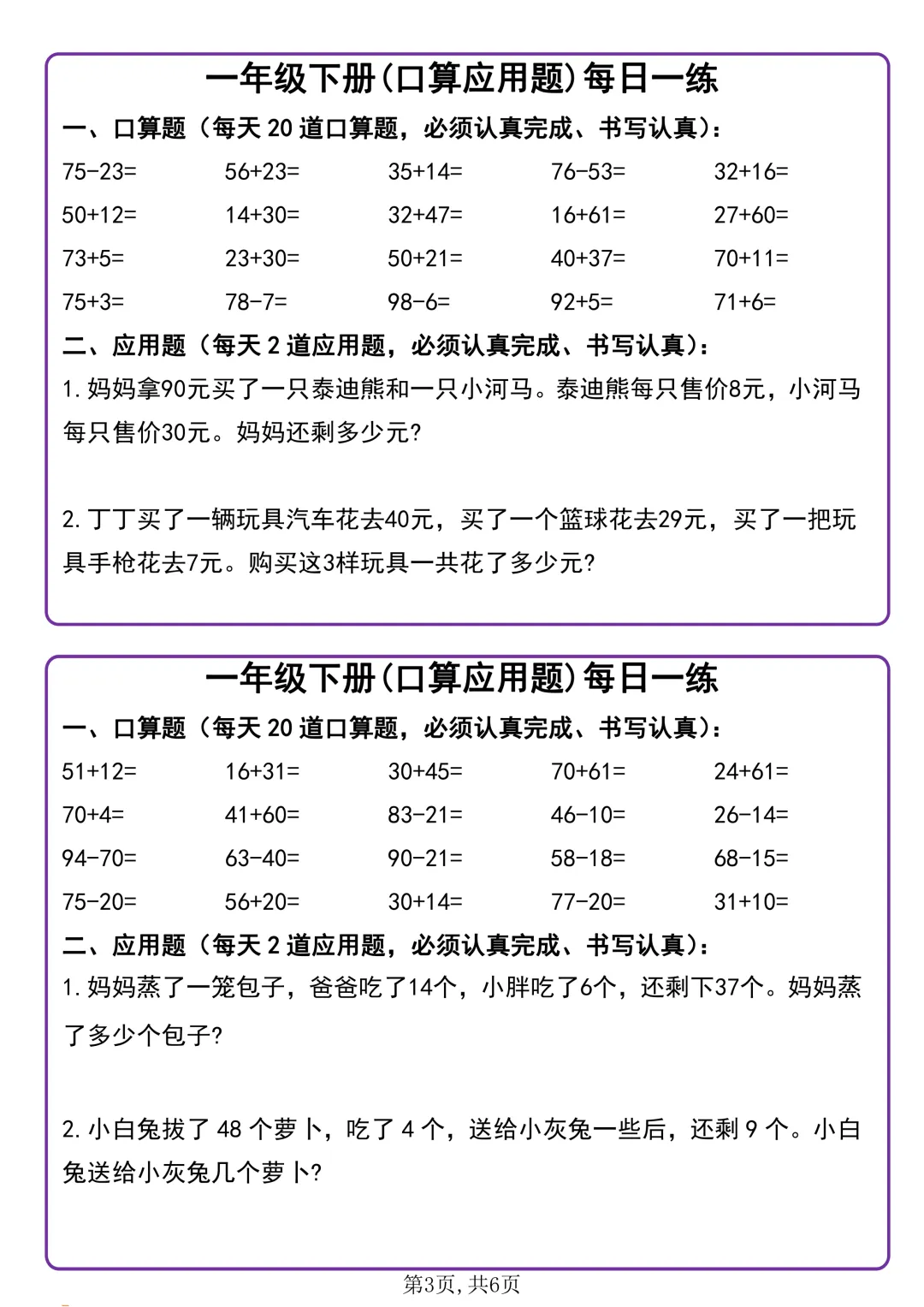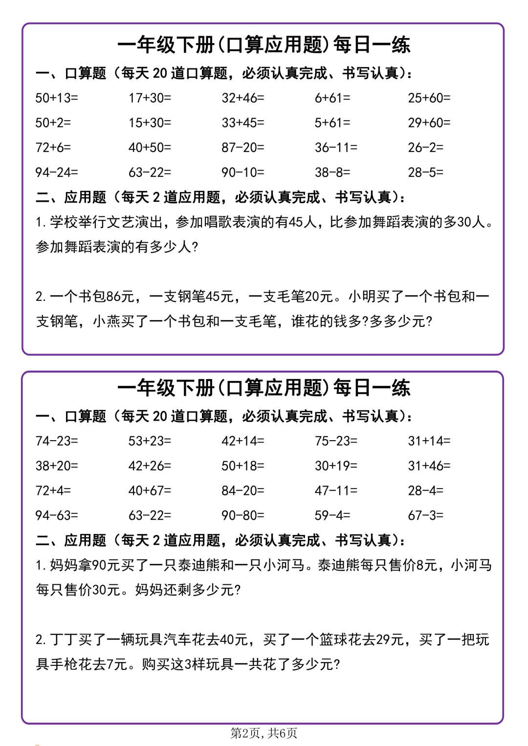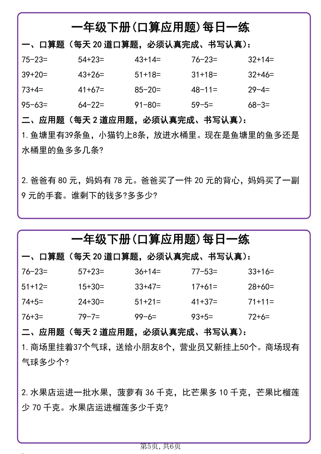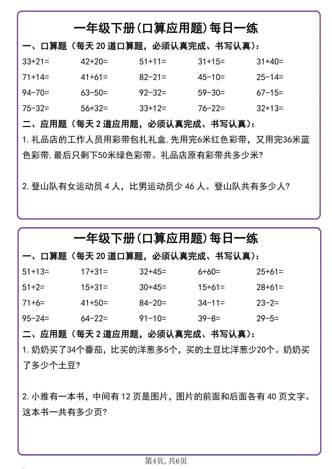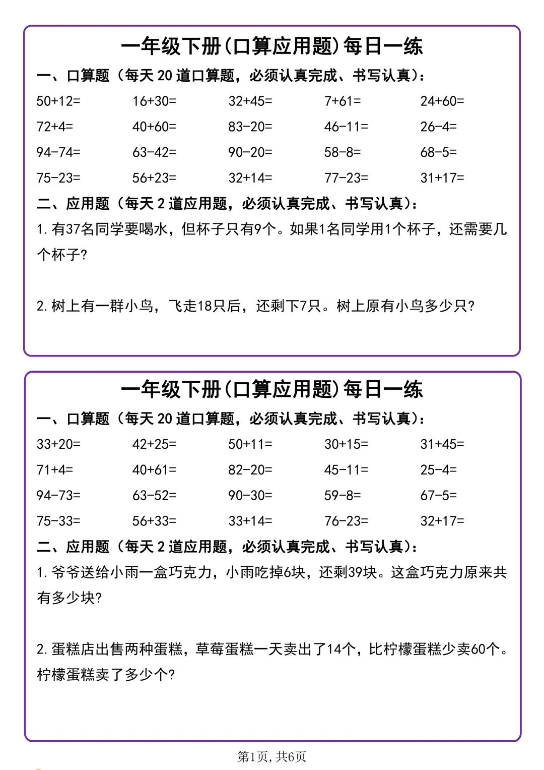 这份资料是一年级(下)数学口算应用题每日一练(全 6 页),专为夯实一年级下册数学基础计算能力和简单应用题解题能力设计,按每日一练编排,题型固定、题量适中,是课内同步巩固的实用练习资料,核心内容总结如下: