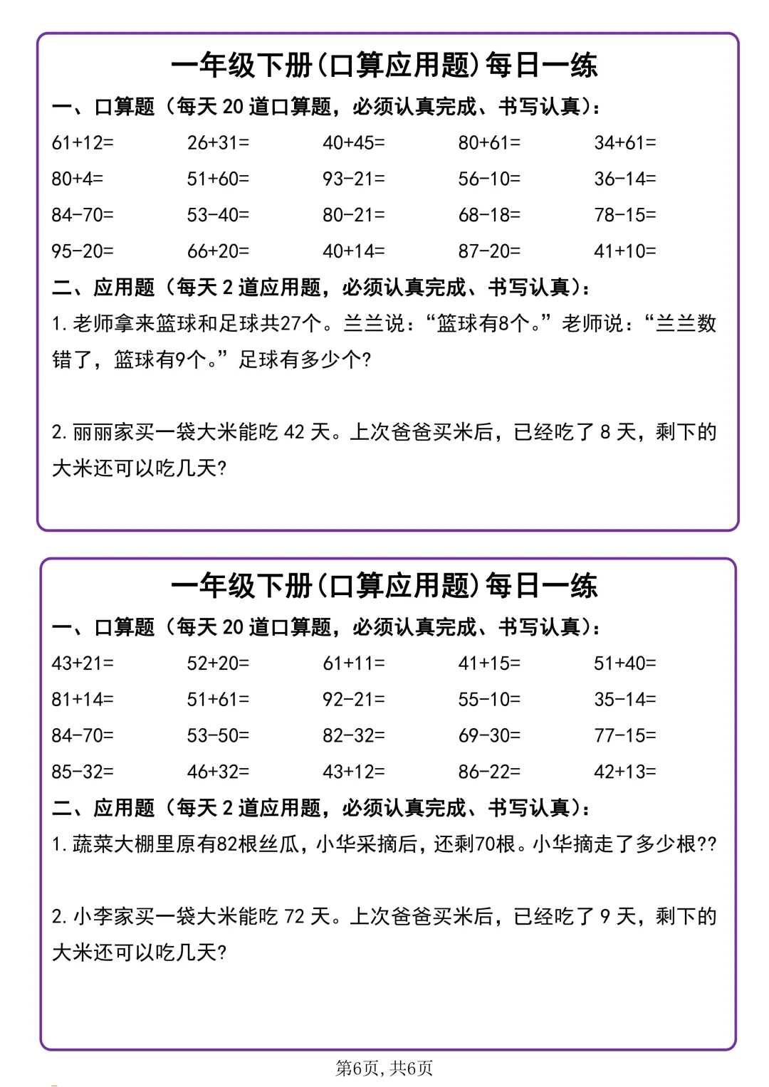 :共 6 页对应 6 天的练习量,无额外填写栏,题型固定为20 道口算题 + 2 道应用题,题量适配一年级学生的学习节奏,计算和应用结合,既巩固基础计算,又训练简单解题思维,适合日常课堂练习、课后打卡或居家辅导。