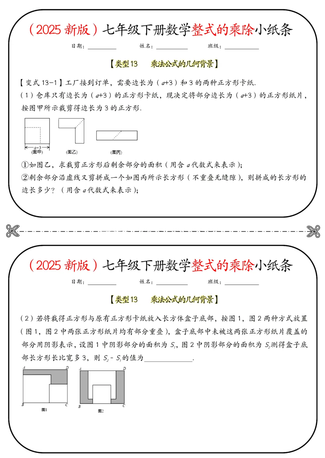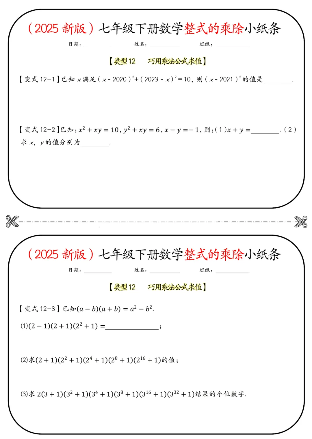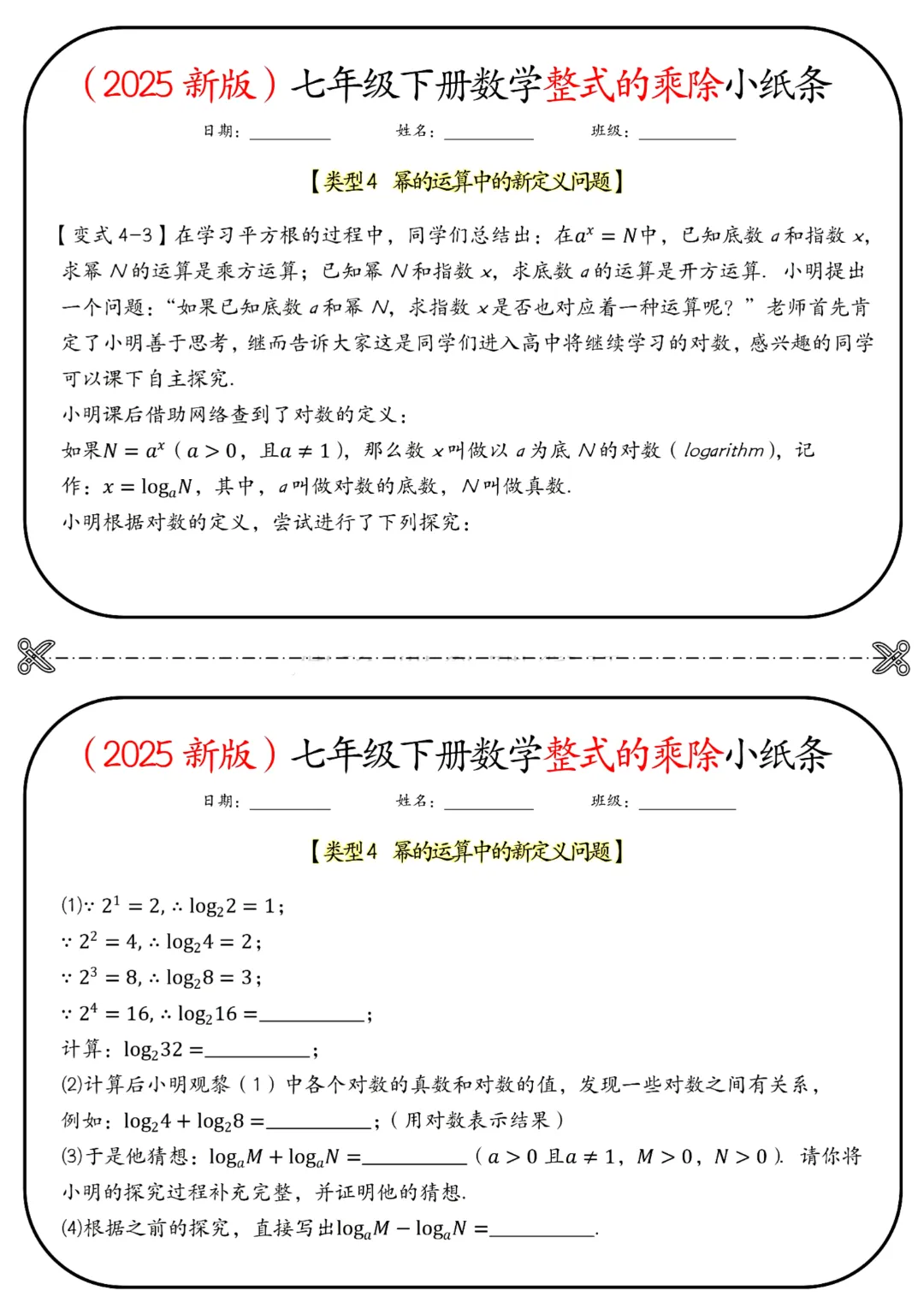 🌟今天给家长们分享的是2026春七年级下册数学北师大版《整式的乘除小纸条》(带答案)完整高清电子版可打印