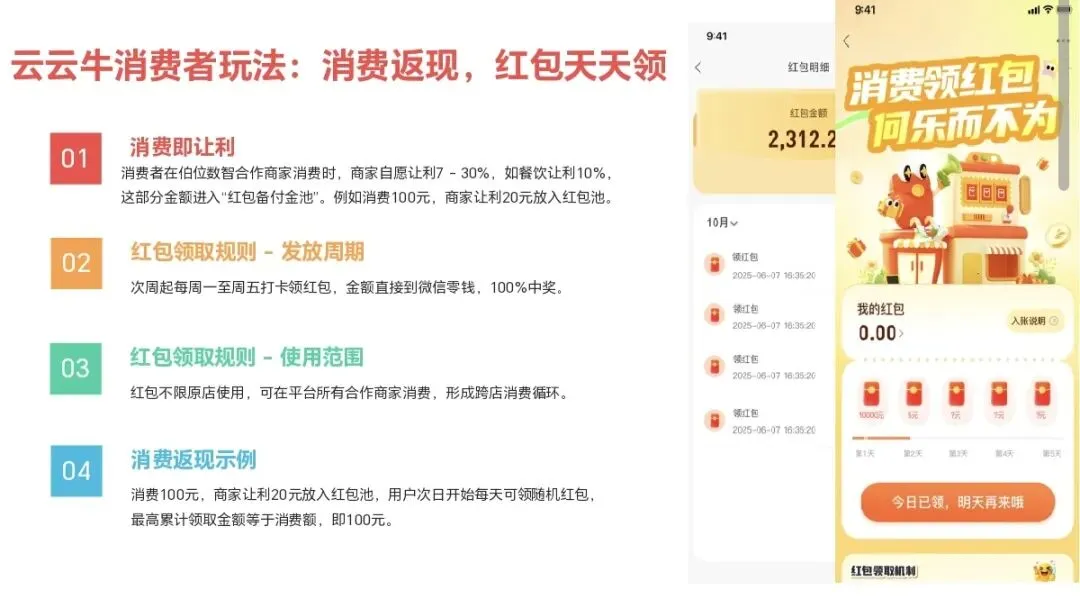 – 红包池机制:商家合规让利注入红包池,AI算法智能分配,每日可领、持续到账